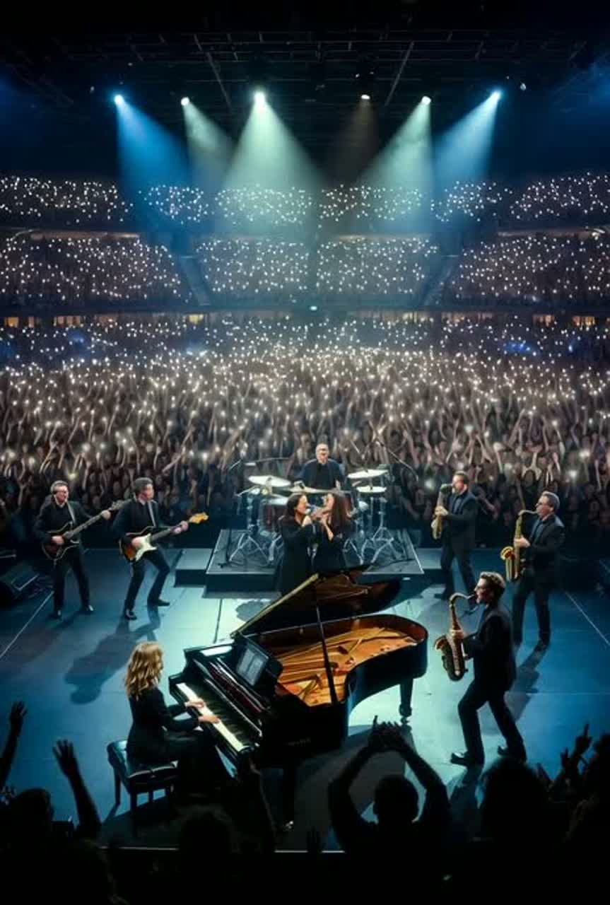 Epic live arena concert 2026 power ballad with subtle Latin fusion, powerful male-female duet vocals ultra melismatic passionate ad-libs, female pianist virtuoso Lola Ast@nova-style dramatic luminous trills runs expressive mastery on latest hybrid grand piano Yamaha CFX blended Genos organ rich golden layers, dual hybrid tenor-alto multi-sax hybrids super ultra melodic intertwining duet different tonal patterns magical melismatic, angelic synth pads ethereal neon-sound textured swells dreamy highly pleasing to critical musicians viral magic, massive stadium crowd interaction cheers yee-haw sing-along, roaring audience Dolby Atmos spatial, grand orchestral acoustic swell, fiddle pedal steel slide guitar bright Hammond layers, synthesized magical percussion pads neon-timbre angelic build-ups, realistic explosive crowd noise hands up eruption, latest edition ultra-premium viral production, dreamy hypnotic emotional build to massive cathartic explosion like Foreigner I Want to Know What Love Is 2026