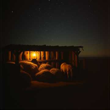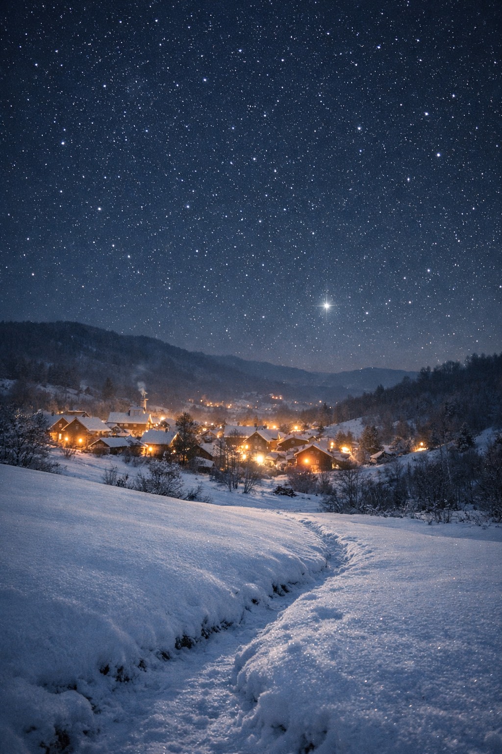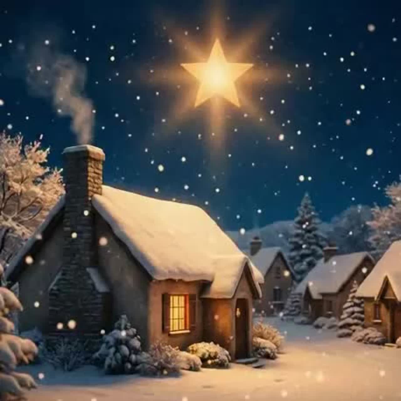 Create a slow 6/8 Christmas ballad in the vintage style of a 1950s–1960s sacred holiday recording, Instrumentation: soft string ensemble, celeste, upright bass, brushed drums, gentle piano, and glockenspiel, Vocal: warm baritone or clear female alto, close-mic, with gentle vibrato and emotionally reverent phrasing, Mood: nostalgic, peaceful, candlelit—evoking reverence and wonder, Harmony: classic major/minor progressions, slow-moving lines with light choir “oohs” under final chorus, Mix: analog tape warmth, natural plate reverb, slight stereo separation, Theme: divine stillness, sacred birth, the hush of incarnation, Include soft orchestral intro and celeste/string fade on outro