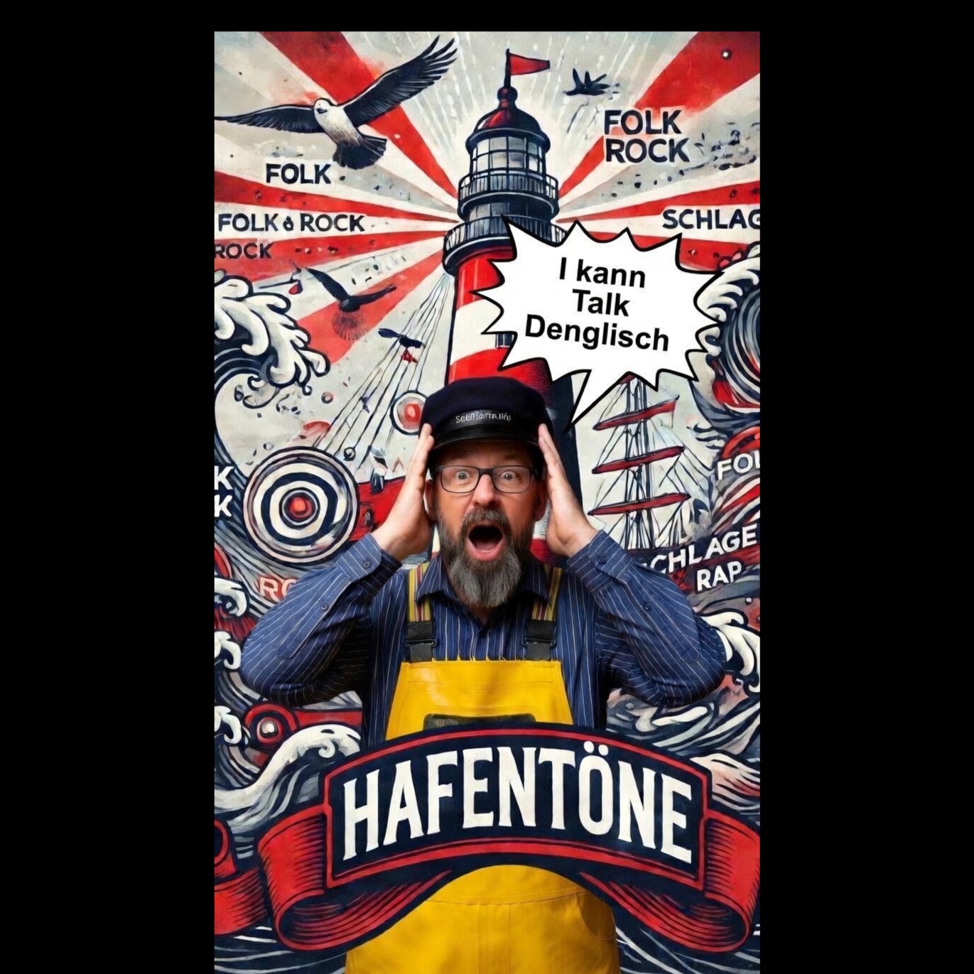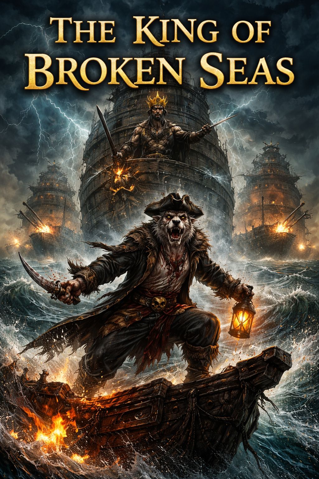 High-energy stomping pirate sea shanty / folk rock, 105 BPM, Heavy boot stomps, bodhrán, war drums, acoustic guitars, aggressive fiddle, Deep gravelly male lead vocal with massive crew chants and call-and-response, Epic naval battle atmosphere with cannons, storm, and shouting crew, Story about the Wolf of the Harbor defeating a powerful sea king and his massive fleet, Loud, raw, anthemic, festival-ready pirate stomp