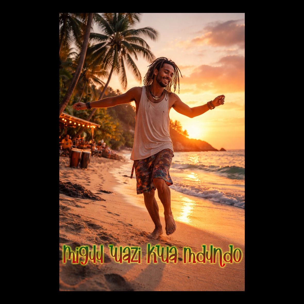 A reggae groove launches with syncopated African drums and vibrant tropical percussion, Bright guitars lay down offbeat skanks, joined by warm bass and a steady drum kit, Steelpan and marimba flourishes intertwine with brass stabs, creating a lively beach vibe throughout each section