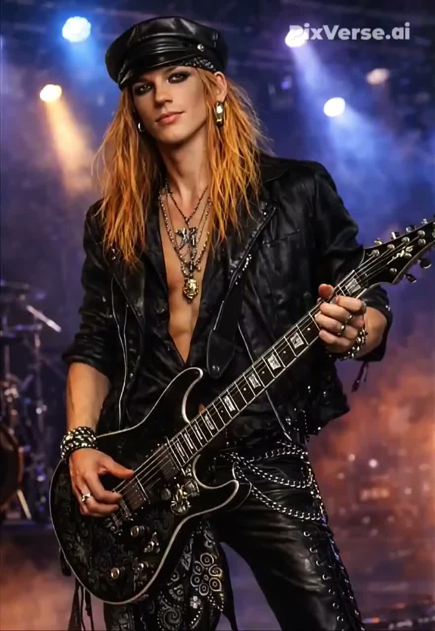 high-gain distorted tone, melodic pentatonic riffs, flashy 80s style guitar solo with bends, slides and fast runs in The Style Of Traci Guns, Rhythm Guitar crunchy distorted, heavy palm-muted power chords, driving glam metal riff, classic Sunset Strip riff style in The Style Of Izzy Stradlin, Mood & Theme : wild, seductive, dangerous, neon night, rock’n’roll attitude, sexy, hot, big 80s glam metal production, wide stereo guitars, punchy bass, analog
