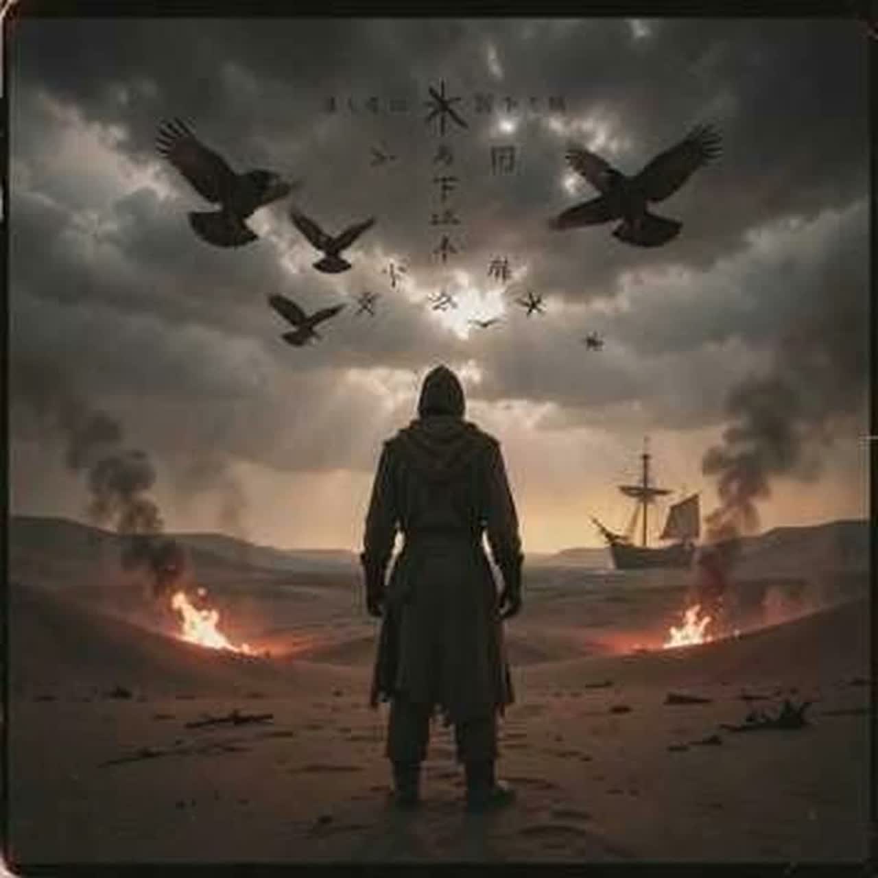 Pure Nordic Viking cinematic storytelling with deep narrative rap and spoken-word delivery, No call-and-response; continuous saga-style flow, Instrumentation includes low war drums, cinematic percussion, droning strings, Nordic folk textures, distant horns, and ambient wind, Dark minor tonalities and slow-building dynamics create a mythic atmosphere, Occasional subtle organic textures hint at distant lands, but the dominant identity remains Viking and ancient, Includes a Danish-language verse to ground the story culturally, The track feels like an epic saga told by firelight—timeless, powerful, and immersive