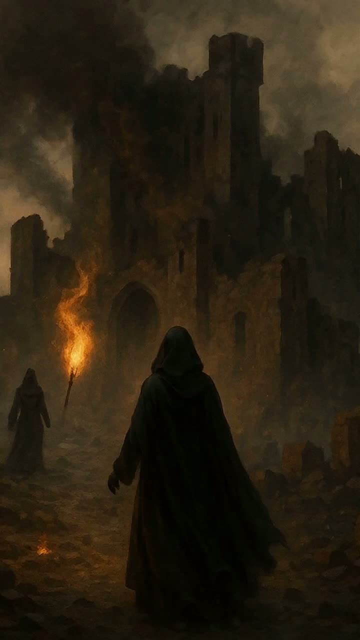 Dark cinematic rock/metal with a haunting, mythic atmosphere, Deep resonant drums, low harmonic choirs, and reverbed electric or acoustic guitar, Emotional, intimate vocals with a confessional tone, Add ghostlike background harmonies to represent echoes from a past kingdom, Slow, powerful build into a sacred, romantic chorus, Mood is haunting, romantic, ancestral, and redemptive — a love reborn from ruins, emerging from shadows into a new world