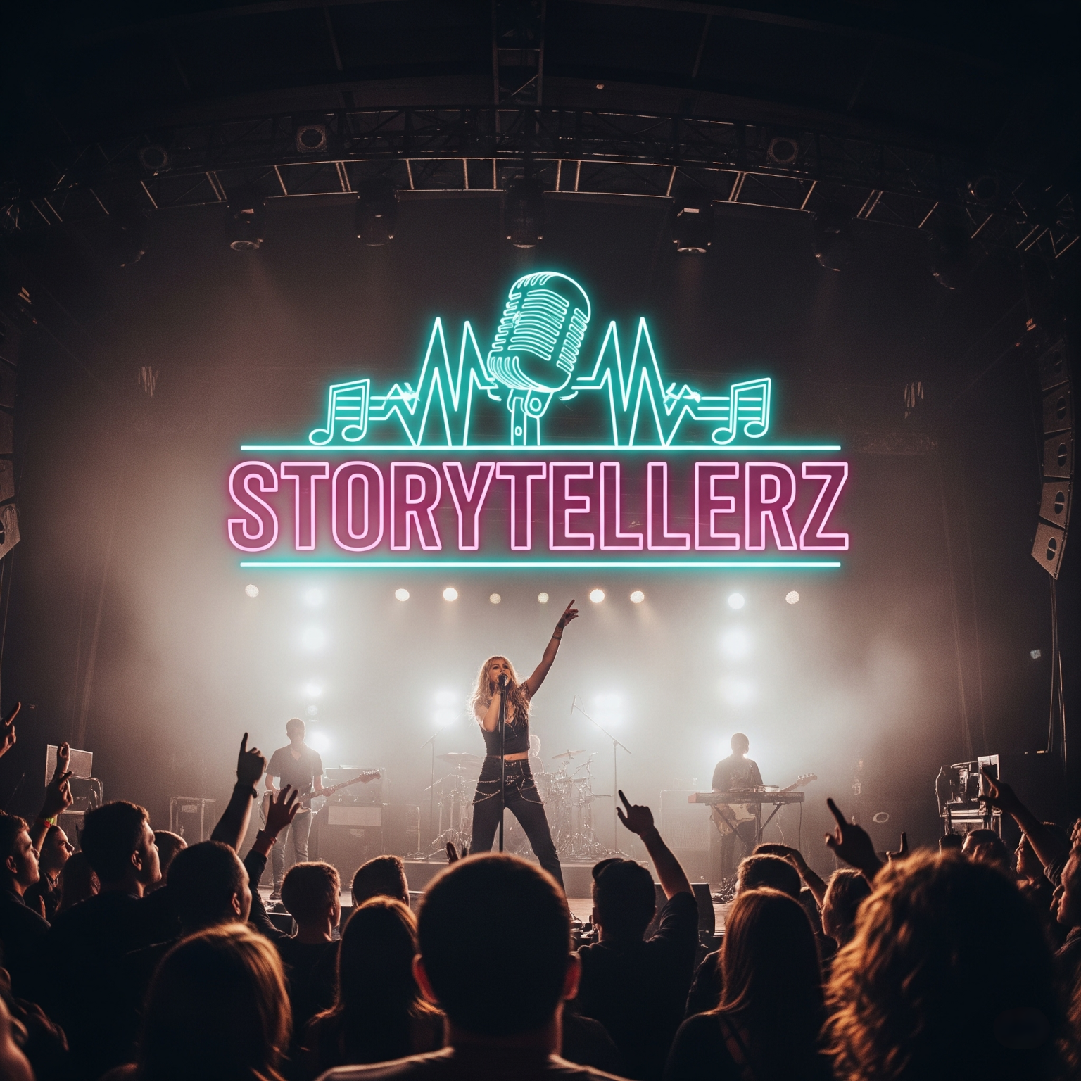 A live rock concert: Energetic synthwave and EDM fusion launches with pulsating synths, crisp drums, and punchy deep bass, Verses blend electric guitar lines with lush synth textures, building momentum, Crowd cheering ebbs under stadium-sized chorus vocals, Live drum fills and bass drops fuel an electrifying finale