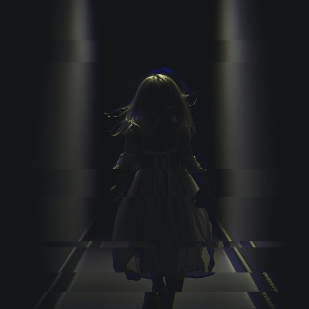 Delicate piano and distorted synths notes open against sparse, eerie textures, creating a haunting atmosphere, Soft, cute female vocals float above minimal, ghostly beats with intense bass distortion elements, Horror atmosphere with music box interludes and glitchcore, As the chorus arrives, distorted synths, pounding EBM drums, metallic strikes, and orchestral swells heighten the suspense and drama