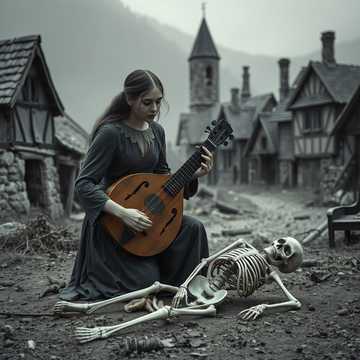 hurdy gurdy, hurdy gurdy driven, folk, dark folk, folk metal, bard, medieval, atmospheric, instrumental, melancholic, low tempo, sorrow, haunting, layered vocal, raspy female vocal, ethereal vocal, raw, breathy, soaring soprano female vocals, progressive metal