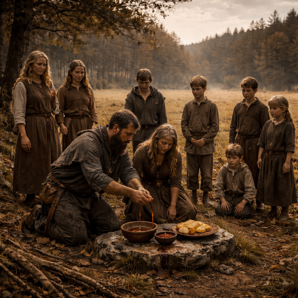Create a ritualistic, ancestral folk piece rooted in pre-Christian northern European traditions, Use slow, deep male vocals in Old English, structured as chant or invocation — not melodic singing, The instrumentation should be raw and ancient: frame drums, wooden rattles, animal horn blasts, and bowed lyres, Atmosphere should be heavy and reverent with ambient elements like wind, crackling fire, and earthy drones, Avoid modern harmony or rhythm — focus on primal repetition, breath, and silence between lines, Include layered call-and-response phrases or group refrains to simulate a solitary ritual evolving into communal presence, The tempo is slow and grounding, This is a land-taking rite: the speaker offers bread, blood, and ale to the land spirits, swears oaths to live in balance, and invokes the presence of the wights through word and sound, Let nature’s textures rise and fall beneath the voice, No melody, No modern instruments, No drums with sharp attack