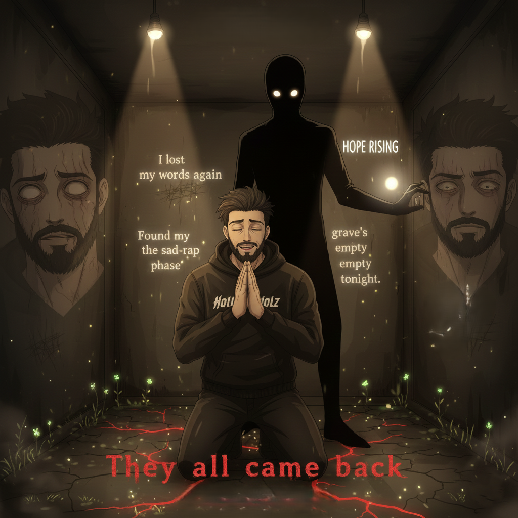 rap, Dusty boom-bap drums, warm bass, and chopped soul samples with a slightly detuned piano loop, Male vocals, intimate and narrative in the verses; hook explodes with layered gang vocals and subtle choir pads, Occasional record-stop FX and filtered drums for transitions, ending on a stripped beat and spoken outro, hip hop