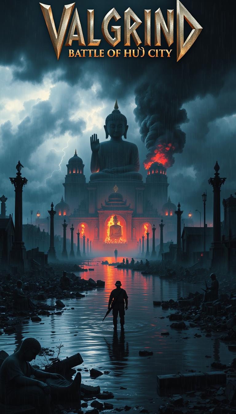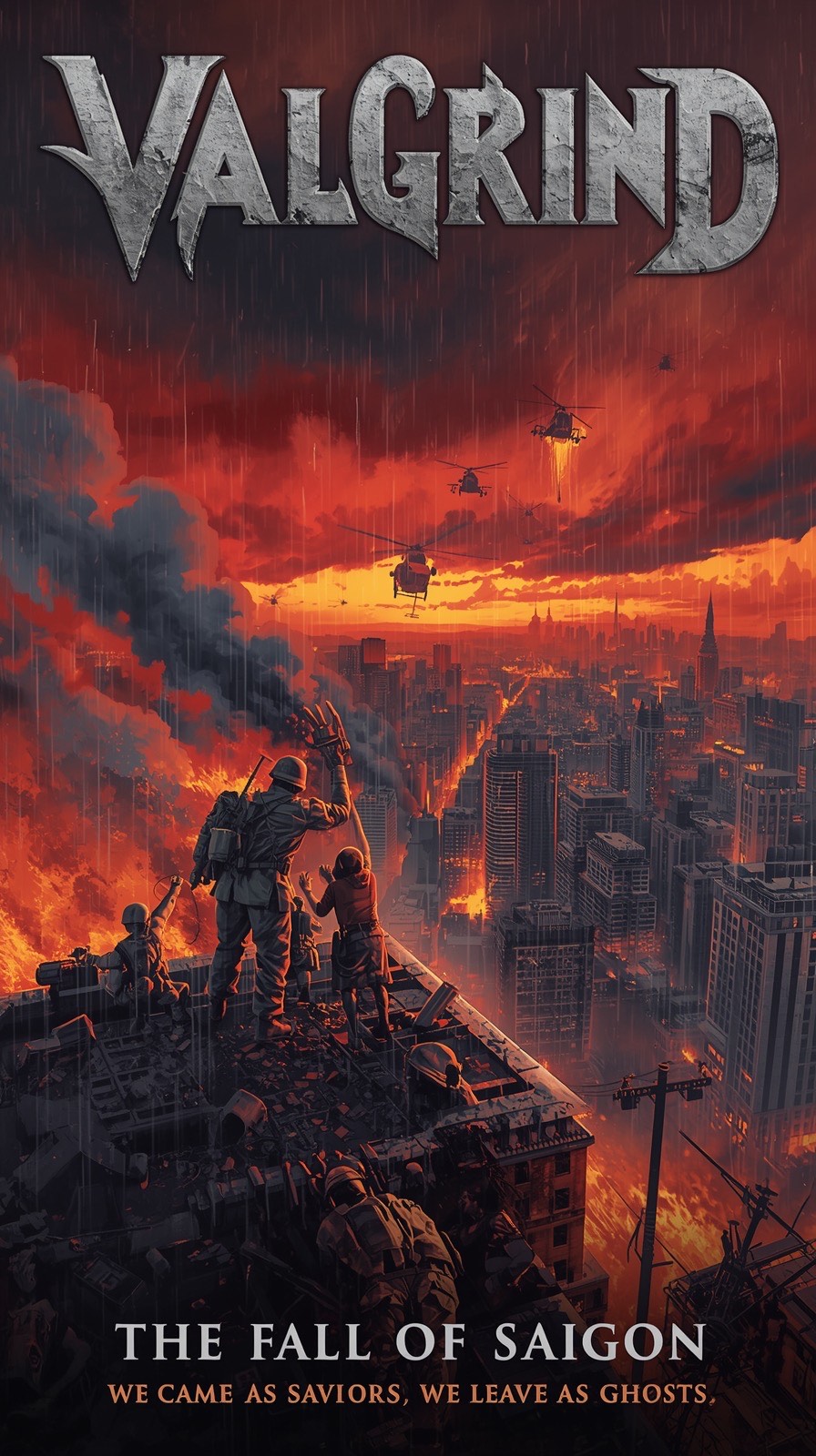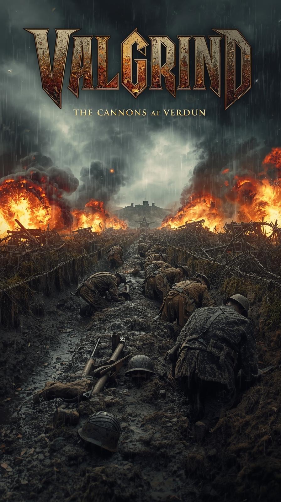 Heavy distorted guitars, pounding toms, marching snare patterns, industrial metallic hits, low brass stabs, dark choir pads, orchestral strings for tension, and a dramatic melodic guitar solo, Occasional distant artillery rumble and battlefield ambience