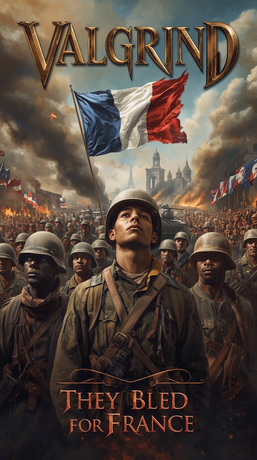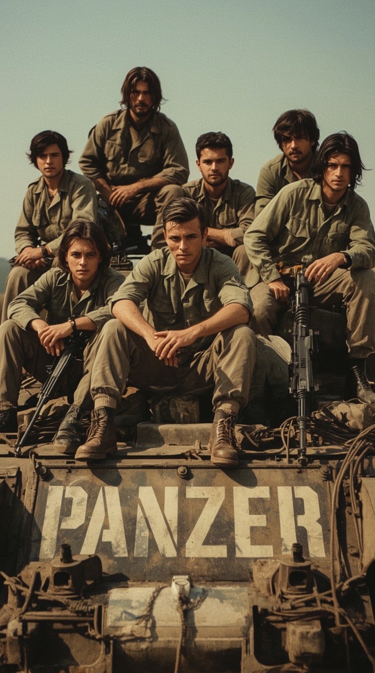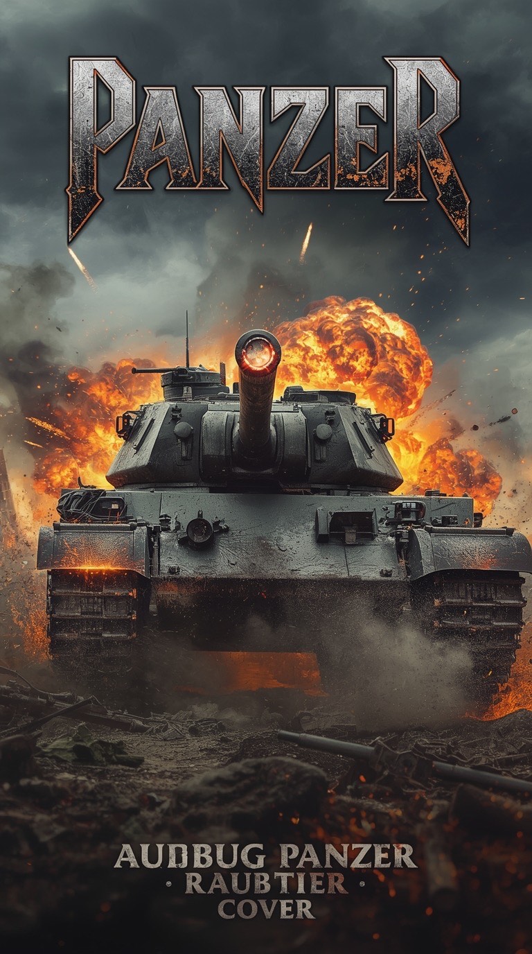 Mid tempo, heavy and melodic power metal with driving rhythm and marching double bass, Gritty male vocals, strong guitars, minimal choirs, Add symphonic keyboards for atmosphere, but keep drums and guitars dominant, Cinematic and heroic tone, evokes armored warfare, smoke, and iron will, Clear, punchy studio mix with battlefield energy and patriotic feeling, Unforgettable sing a long choruses