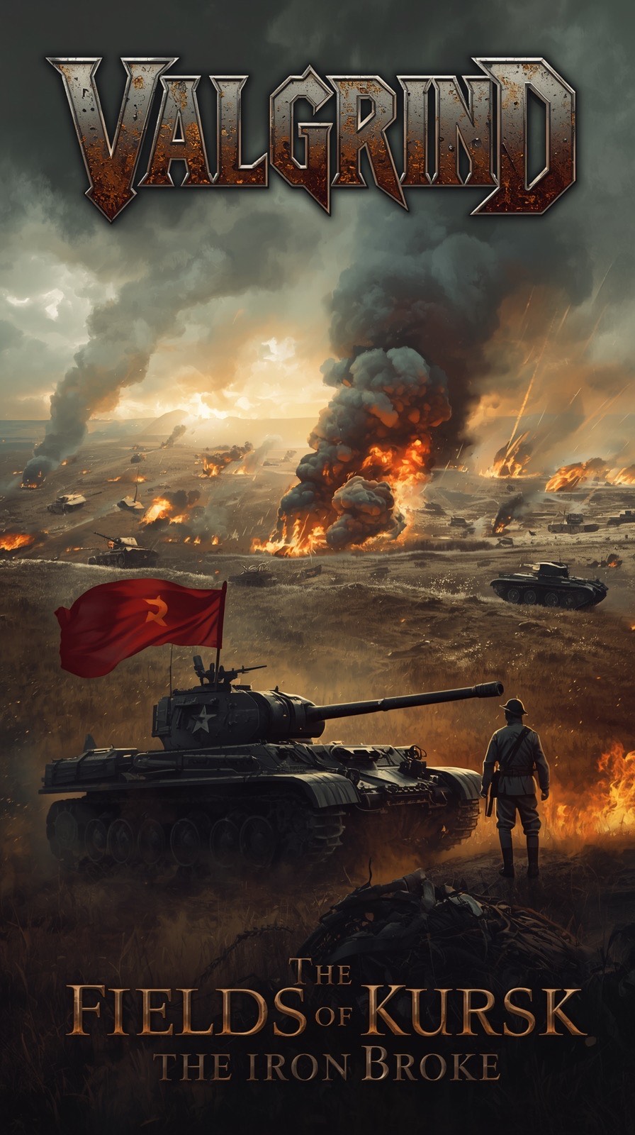 Epic mid-tempo power metal with marching rhythm and cinematic atmosphere, Heavy rhythm guitars, melodic lead lines, and deep, commanding baritone vocals with metallic rasp and heroic tone, Clear, militant phrasing with minimal vibrato, Thunderous drums and orchestral brass supporting a massive battlefield sound, Long expressive guitar solo in the bridge, Bright, wide studio mix emphasizing depth, power, and dynamics, Overall tone: tragic, unstoppable, and triumphant — the sound of steel meeting fire on the Eastern Front, Deep, powerful baritone male vocals with metallic rasp and commanding tone, Militant and heroic delivery with march-like rhythm, clear pronunciation, and strong diction, Minimal vibrato, straight tone, and triumphant, commanding vocal presence, The vocals should dominate the mix like a battlefield commander