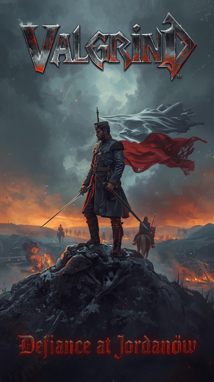 Power Metal/War Metal, Deep, powerful baritone male vocals with metallic rasp and heroic tone, Militant and commanding delivery with march-like rhythm and clear pronunciation, Minimal vibrato, strong diction, and epic battlefield narration style, Triumphant, heavy, and dynamic vocal presence