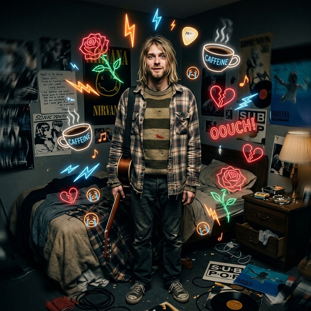 Grungy 1990s Seattle sound alternative rock anthem with raw, distorted electric guitars, thick fuzz bass, and pounding, minimal hard hitting drums, Arpeggiated intro, Soft in the verses and loud in the melodic chorus, The production should feel like the first take, gritty, and unpolished with lots of dynamic shifts between quiet verses and explosive choruses, Verses should be brooding, slacker-like, almost mumbled with a detached tone, then explode into harsh, anguished shouting in the chorus with a raspy, strained vocal delivery, The male singer should sound young, raw, raspy, grunge, disaffected, and sarcastic, with moments of deadpan muttering and sudden screams, Guitar should use power chords, feedback, and occasional chaotic noise, Overall mood: rebellious, darkly angry, frustrated but catchy, with an anthemic chorus that feels like a release of pent-up energy, melodic, catchy, memorable