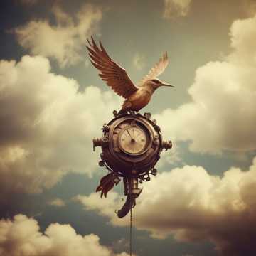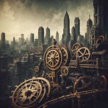 Melancholic yet uplifting waltz, mechanical percussion, soaring brass crescendos, playful accordion melodies, haunting strings, industrial undertones, rich choral harmonies, steampunk, hevay basslines