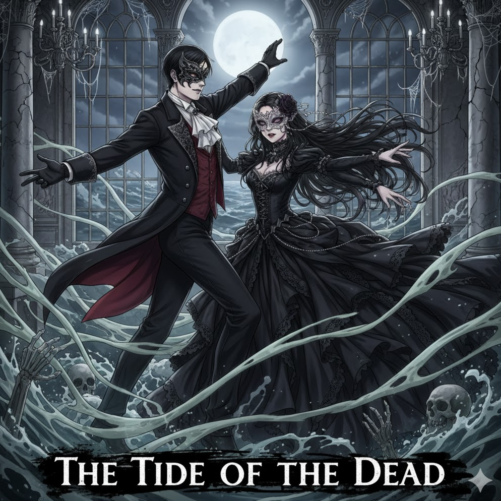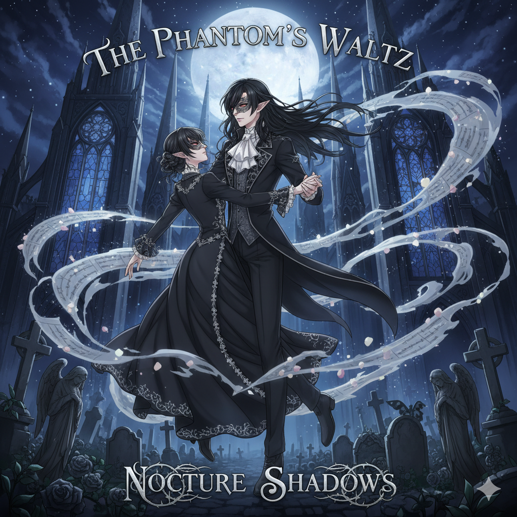 featuring strings, deadly waltz with orchestral grandeur, male vocals, and ethereal choir accents, deep piano chords, basso profondo, opera, melodic, haunting, tone, ballroom