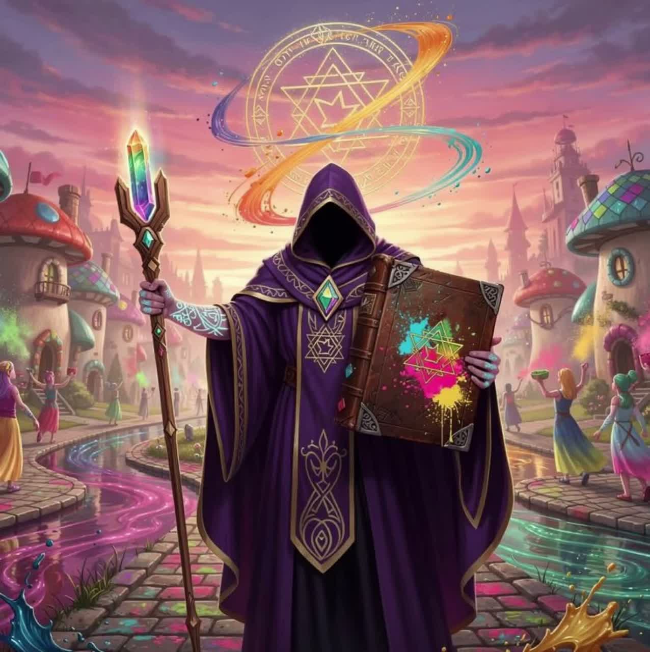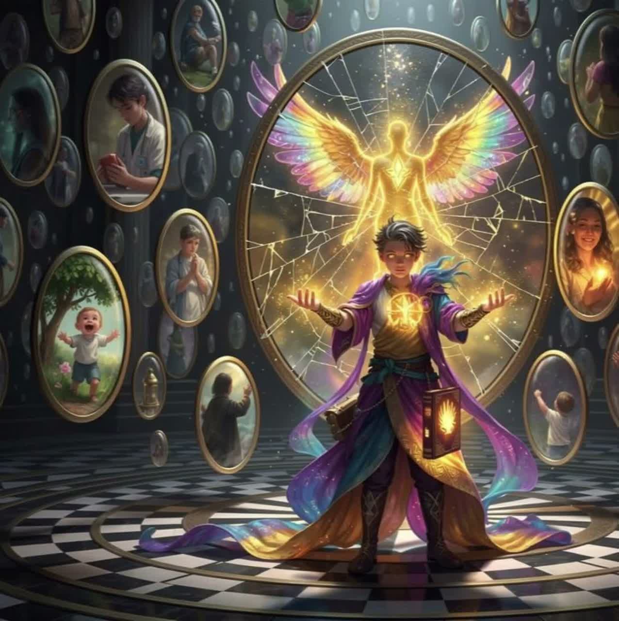 cinematic introduction blending Celtic harp, minimalist piano, and soft electronic textures, The mood is a mix of solemn ceremony and adventurous anticipation, The voiceover should feel like a wise deep males storyteller inviting listeners into a grand tale—warm, mysterious, and full of wonder, Lyrics in English, metaphorical, and poetic, exploring themes of light, color, and the secrets of the soul, After a while into the storytelling, the orchestral effects and choirs are amplified, with metal orchestral elements and electro harmonix