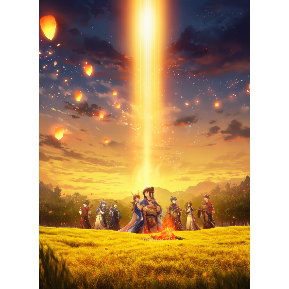 New Age + Techno fusion, majestic and festive atmosphere, 4/4 steady beat, Airy synth pads, orchestral layers, and ethereal choirs, Use bells, taiko-like percussion, and arpeggiated synths, Chorus should feel like a ritual chant with repetition, evoking gratitude for harvest and prayers for the next season, Grandeur with a celebratory and sacred tone, evoking ancient harvest festivals with song and dance, High-quality mastering, wide stereo space, reverb-rich soundscape, high-resolution sounds