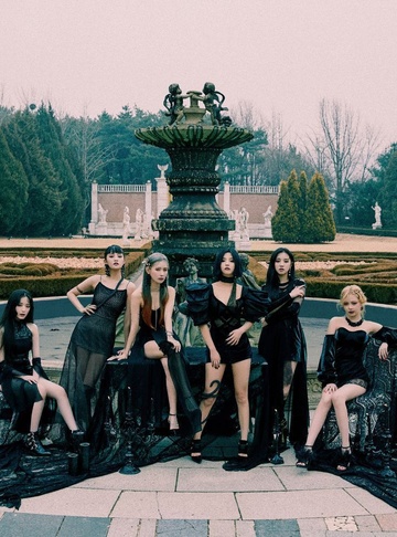 female vocals, girl group, dark-coquette, V, I, LE's most visceral and disruptive track, The musical production should be industrial, with heavy metallic percussion marking the rhythm like hammer blows and a bass synthesizer, Industrial Pop / Alt-Kpop, atmospheric, iconic, female singer