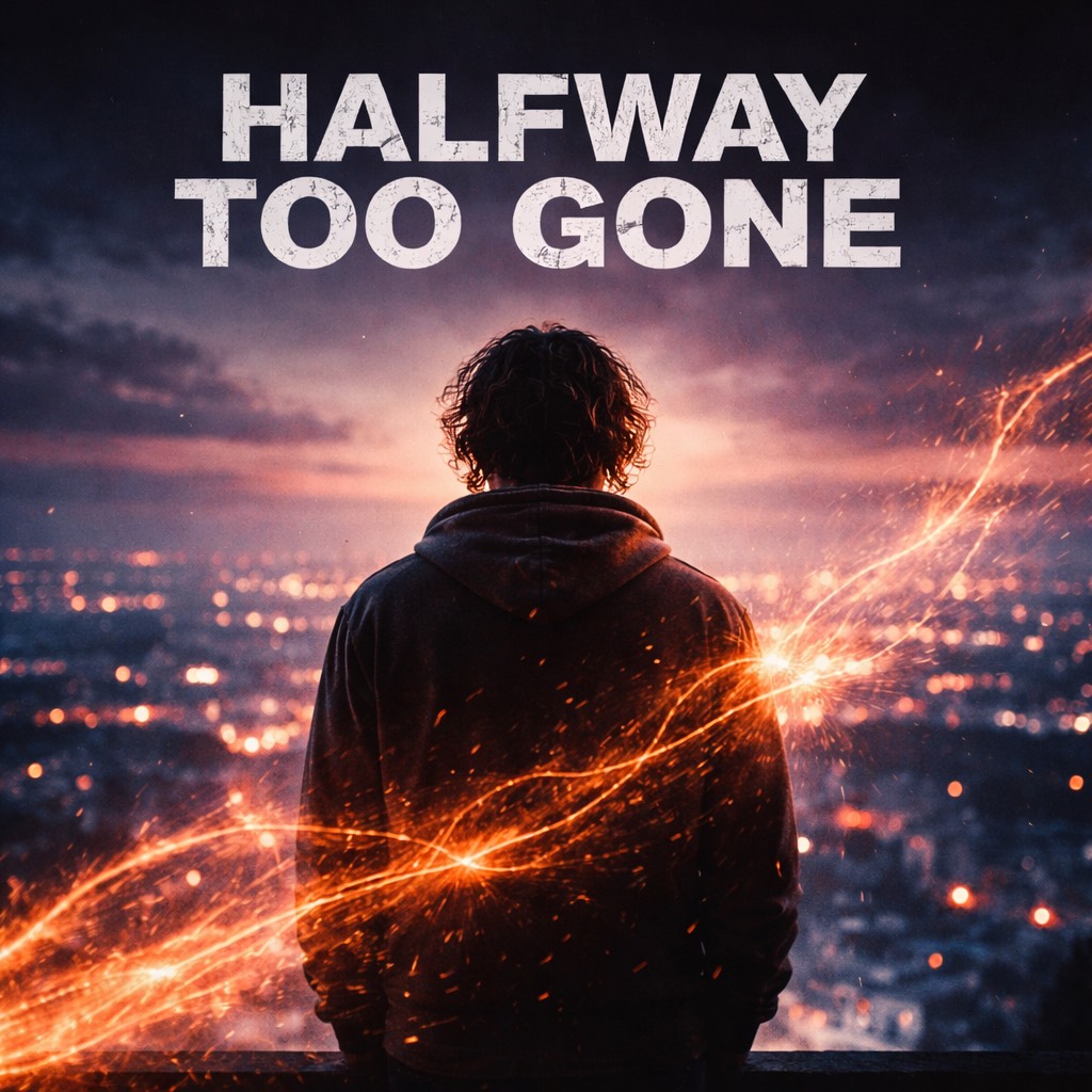 “Halfway to Gone” should feel suspended, like time paused mid-decision, The track opens with soft ambient pads and a distant, muffled piano motif, as if heard through a wall, Verses stay minimal with restrained drums, muted guitar swells, and intimate vocals close to the mic, capturing uncertainty and emotional fatigue, The chorus expands subtly, not explosively, with warm synth layers and low bass creating emotional weight without release, Background harmonies creep in like thoughts you can’t silence, The bridge strips nearly everything away, leaving voice and texture before the final chorus returns heavier, resigned, and unresolved, The song should end without full closure, fading like a step never taken