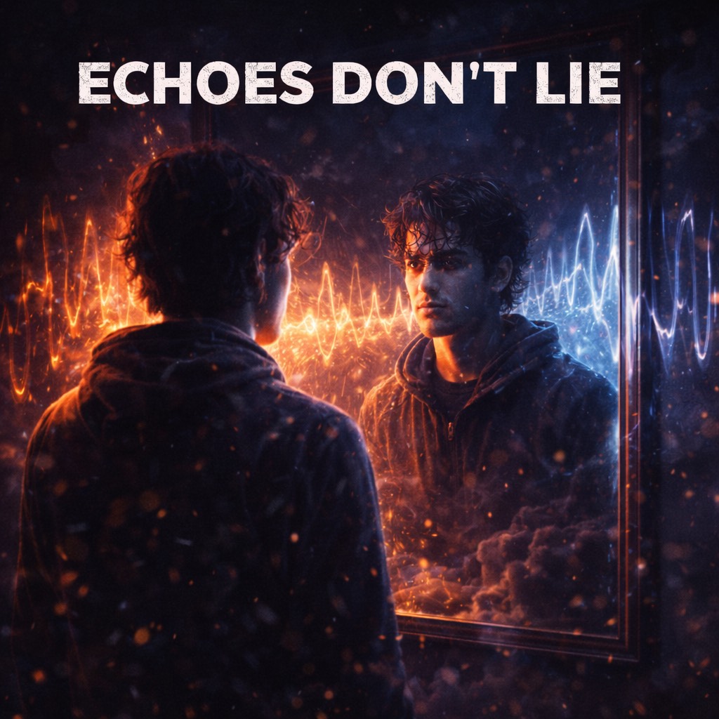 “Echoes Don’t Lie” should feel spacious, tense, and introspective, The production relies on minimal electronic elements, deep sub pulses, and heavy use of delay and reverb to create literal echoes in the mix, Vocals bounce subtly between left and right channels, creating a sense of reflection and repetition, Percussion is sparse and precise, leaving intentional gaps where silence becomes part of the rhythm, The chorus doesn’t explode but expands outward, feeling wider rather than louder, The bridge strips back to nearly nothing, allowing echoes of previous lines to overlap before resolving into a calm, grounded final chorus, The track should feel like standing alone in an empty room, finally listening