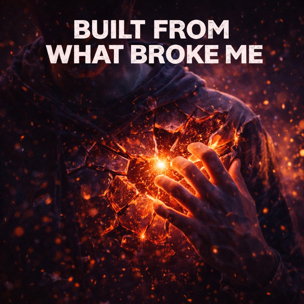 “Built From What Broke Me” should feel resolute and grounded, like emotional bedrock, The track opens with warm piano and low strings, steady and patient, Verses are restrained with controlled drums and subtle bass, letting the vocal carry conviction rather than volume, The chorus swells with layered harmonies, full drums, and wide instrumentation, but never overwhelms, Everything feels earned, not explosive, Textures grow thicker as the song progresses, symbolizing reinforcement rather than chaos, The bridge strips instrumentation briefly before returning with added weight and warmth, The final chorus should feel complete, strong, and calm, like standing tall without needing applause