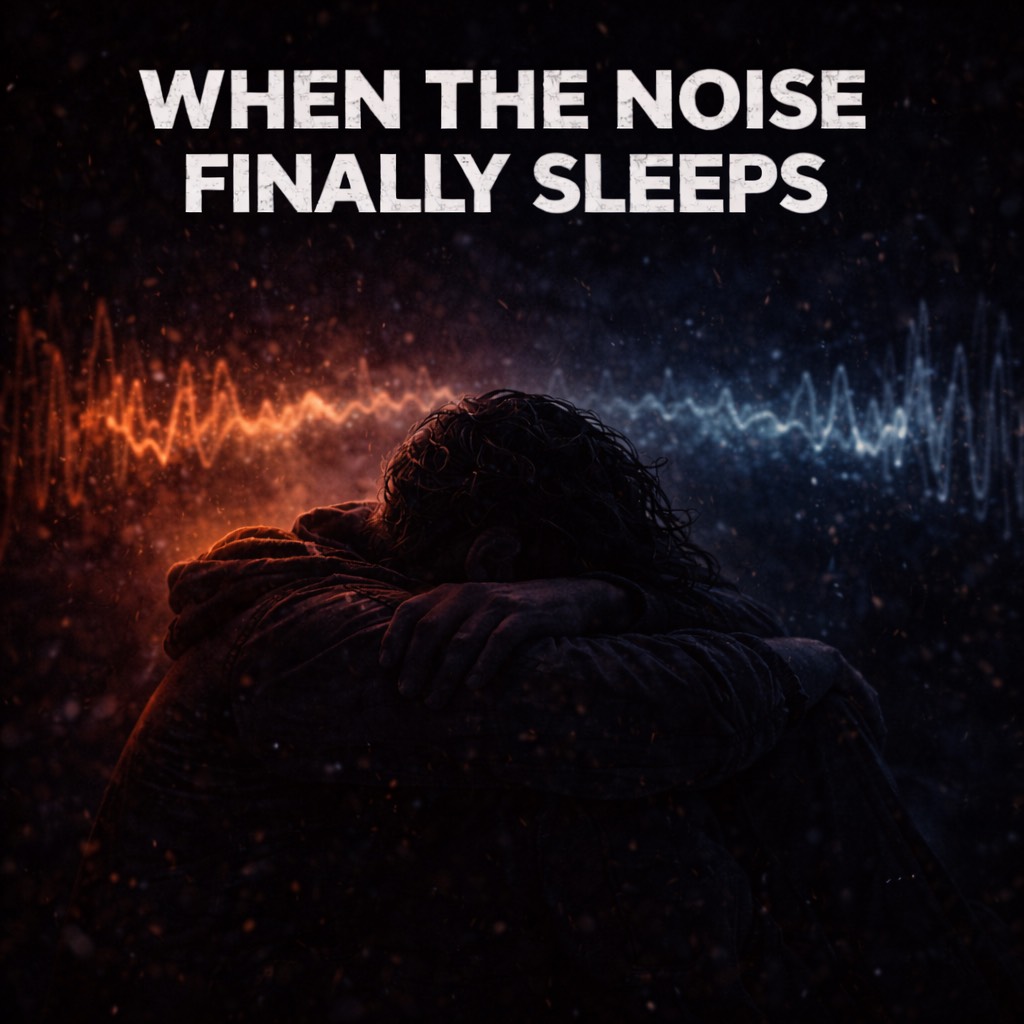 “When the Noise Finally Sleeps” should feel like a gentle landing after a long flight, The production is ambient and minimal, built around soft piano, warm pads, and faint tape hiss that gives the track a lived-in feel, No drums, or only distant, brushed textures that barely pulse, Vocals are intimate and close, almost whispered, with long reverb tails that fade naturally rather than cutting off, Subtle strings or synth swells enter late to add warmth, not drama, The song should slowly dissolve instead of ending cleanly, leaving the listener in calm silence, It should feel like turning the lights off in a safe room