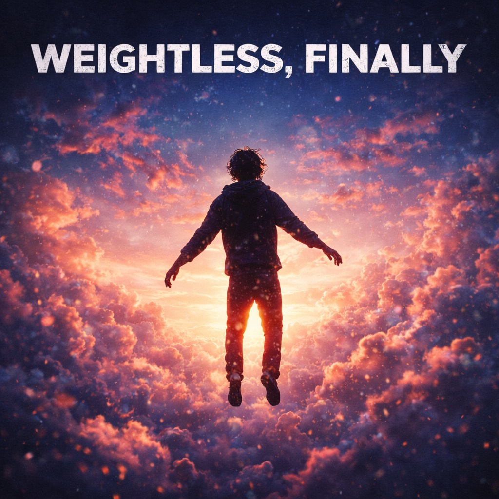 “Weightless, Finally” should feel euphoric but earned, like relief after endurance, The track opens with bright, airy synths and subtle vocal chops that feel like sunlight breaking through clouds, Percussion is light and propulsive, with clean kicks and shimmering hi-hats that create lift without heaviness, Verses stay buoyant and open, allowing space between elements, The chorus expands upward with layered harmonies, wide stereo imaging, and a warm, rolling bass that supports rather than weighs down, The bridge strips rhythm briefly before a final chorus that feels airborne, The song should feel like floating forward, not escaping backward