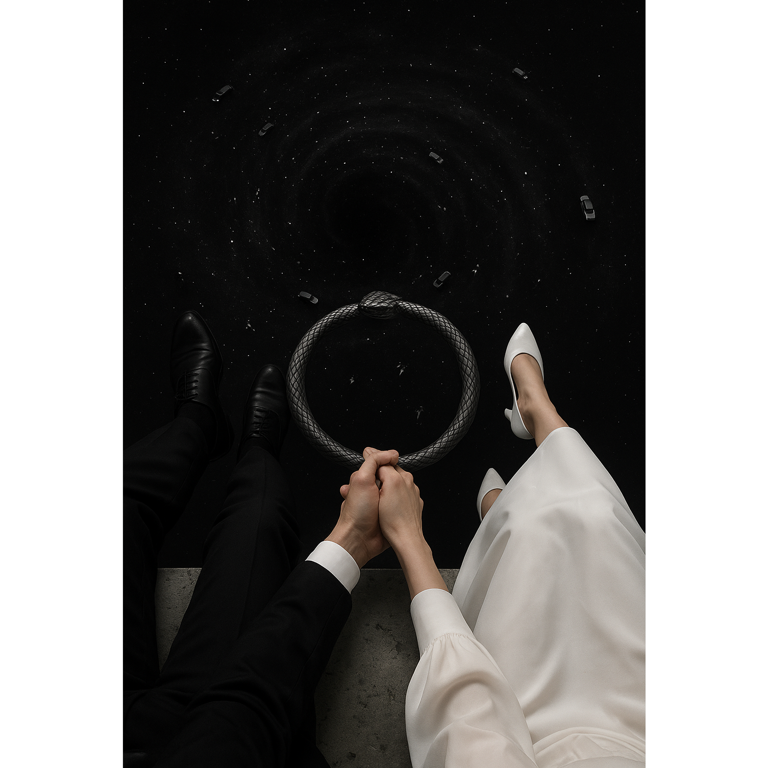 Dark pop/folk duet, male lead low/bluesy, female Vocalise high/crystal, Tempo 90 BPM, chords Bm–G–D–A (low octave), vocalises on breaks, outro spoken female with echo