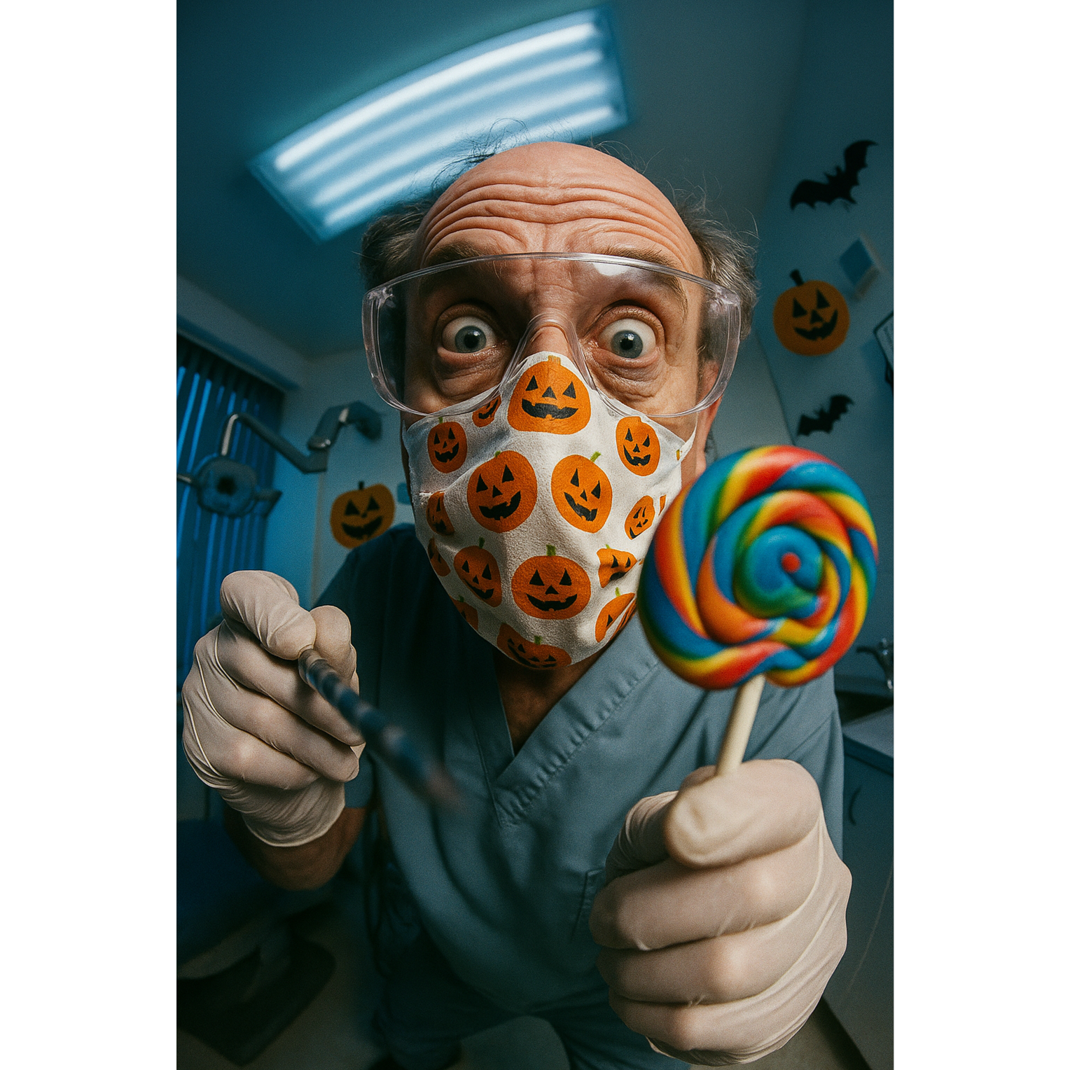 Creepy-comic Halloween song, Burton-style, male spooky voice, tuba, xylophone, pizzicato strings, accordion, organ accents, wicked chuckles, ooh/ahh, sinister candy/dental theme, playful dark humor