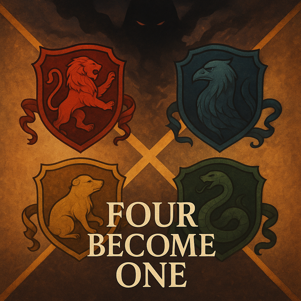 Opening with a grand orchestral intro—layered strings, dramatic percussion, and a sweeping choir—each verse highlights a house with distinct instrumentation (harp for Ravenclaw, brass for Gryffindor, woodwinds for Hufflepuff, dark strings for Slytherin), Tense bridge escalates with urgent strings and pounding drums, All culminates in a soaring, unified chorus with full choir, lush orchestra, and triumphant brass, capturing unity in grandeur, Each house is a different vocal range Gryffindor- tenor Slytherin - bass Hufflepuff- Alto Ravenclaw- Soprano
