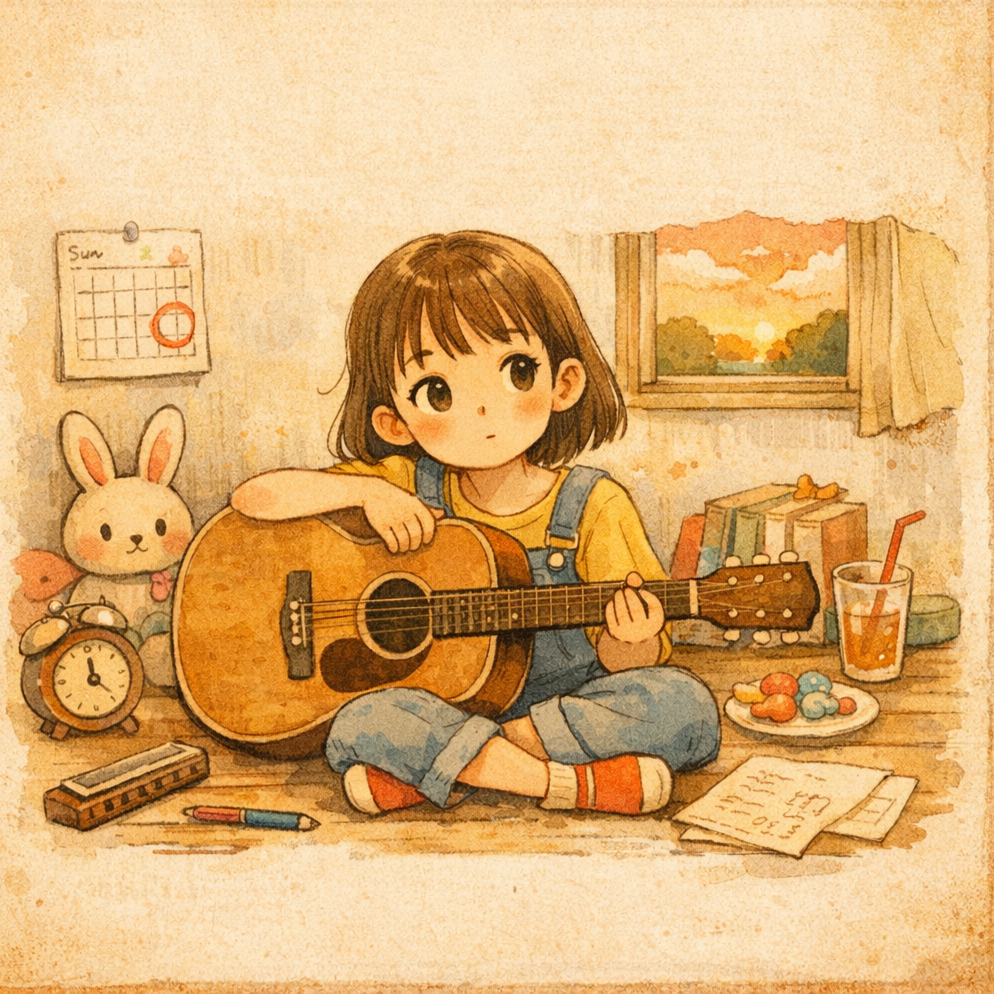 Female vocal, nostalgic Japanese pop, warm acoustic arrangement, gentle tempo, minimal instrumentation, soft piano and acoustic guitar, subtle strings in chorus, calm, childlike but slightly reflective mood