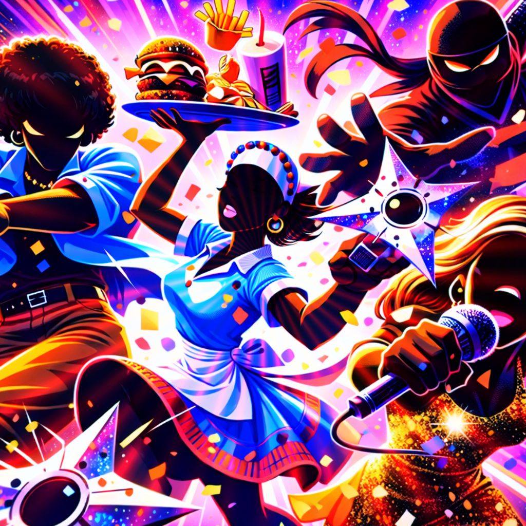 bright piano stabs, cheap string hits, plastic brass bursts that sparkle without meaning, Chopped voice samples shout fragments like “It’s Party Time!”—