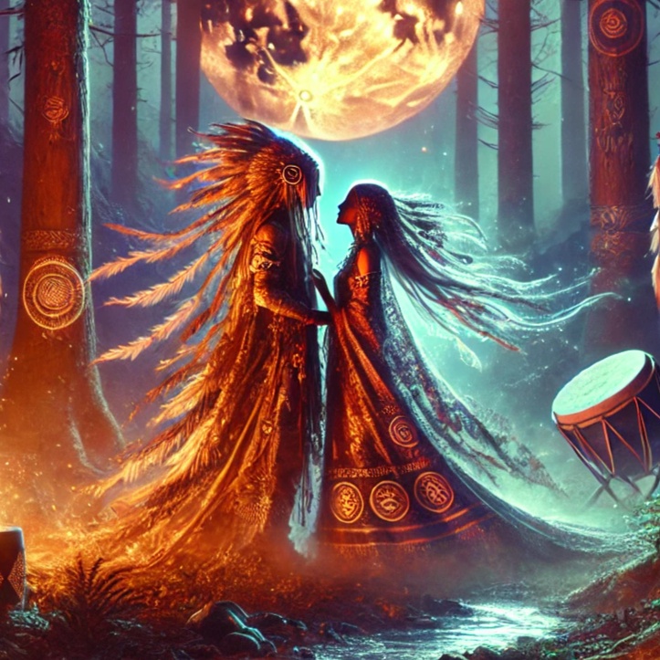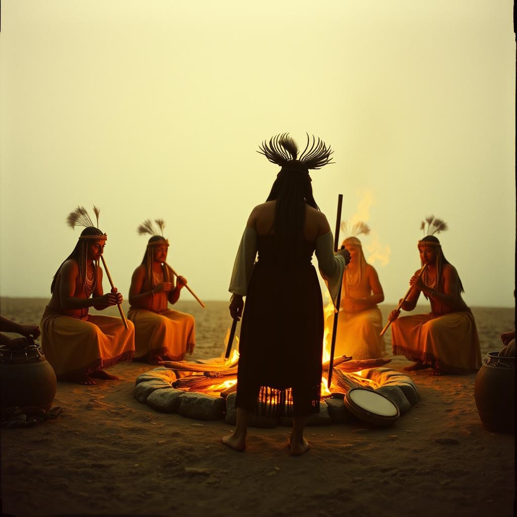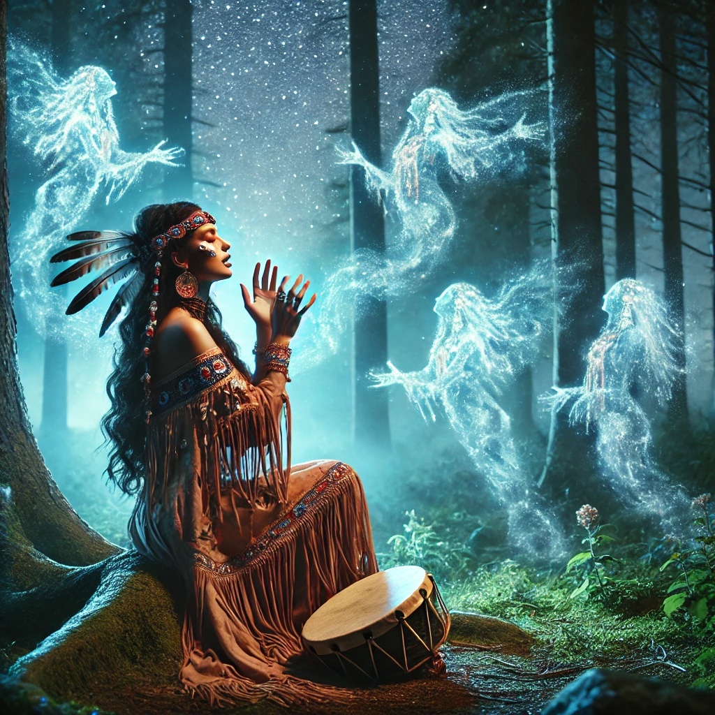 Tribal Native American chant with deep rhythmic drums and fast-paced percussion, A mystical, emotional female voice with powerful yet ethereal tones, evoking ancestral wisdom, spiritual energy