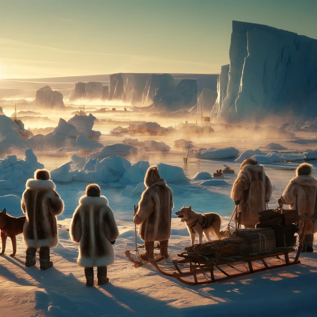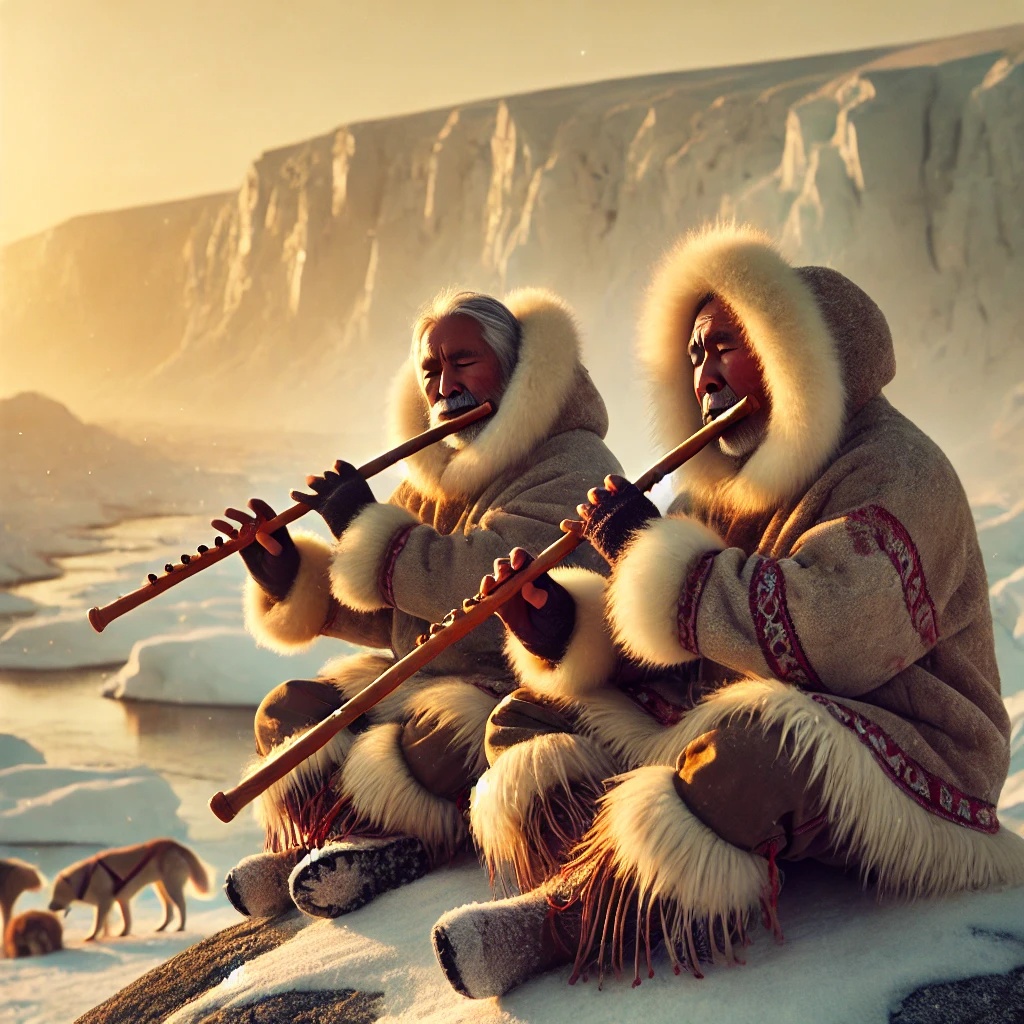 Native American, Katajjaq style, Inuit singers performing traditional throat singing, Katajjaq, in a snowy Arctic landscape, dressed in fur-lined clothing, under the aurora borealis