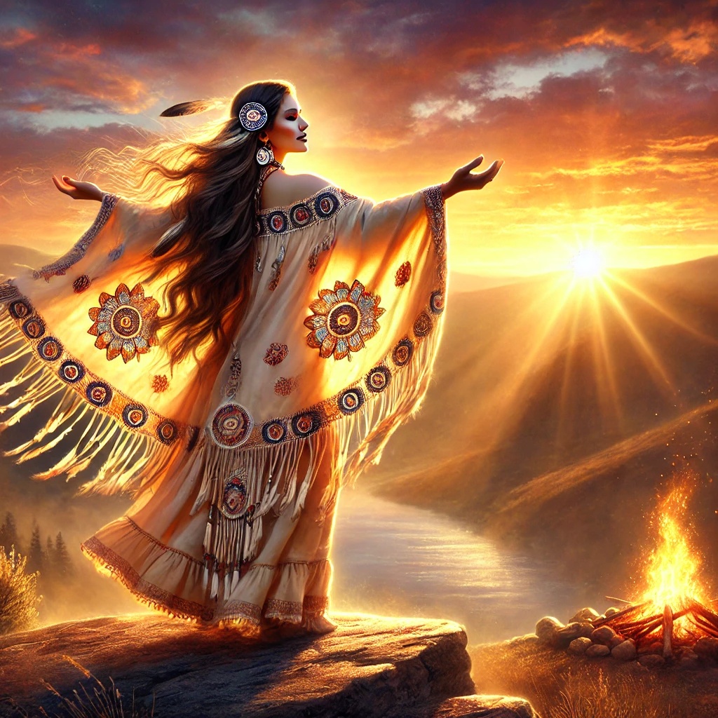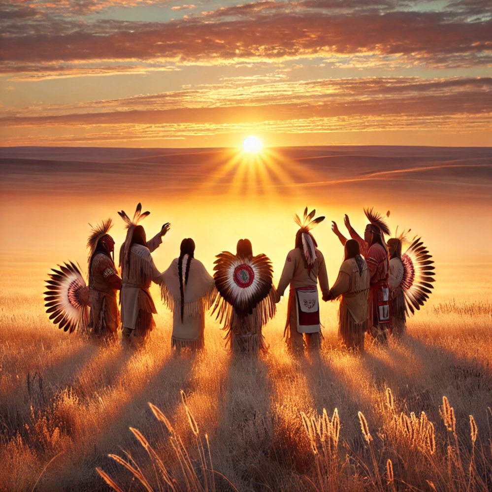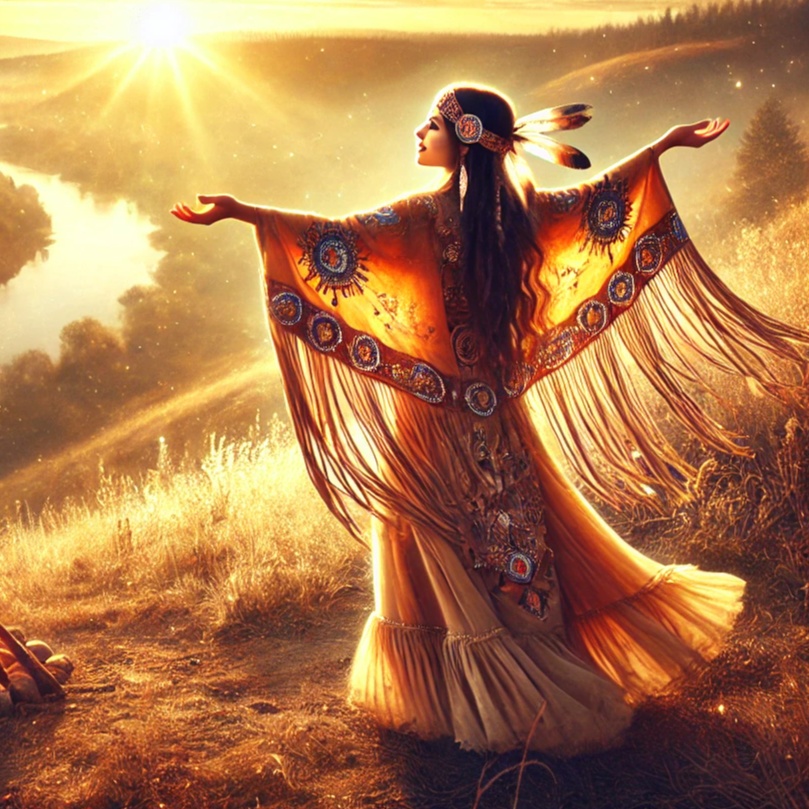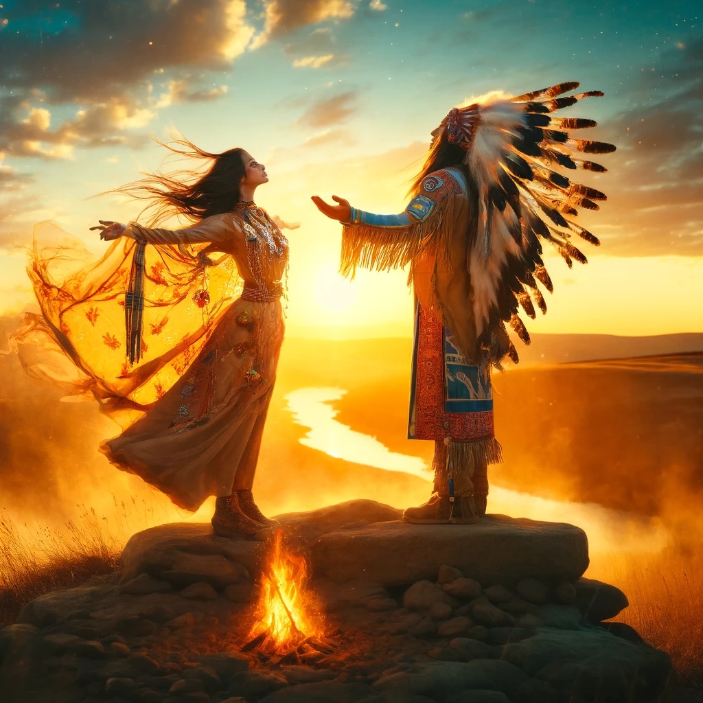 Native American, Sioux style, Edm, Naughty house, Dark bubblegum pop, Synths, deep drum beats, Sioux, percussion, Djembe, evoking light, love, and unity, spiritual, and atmospheric sound