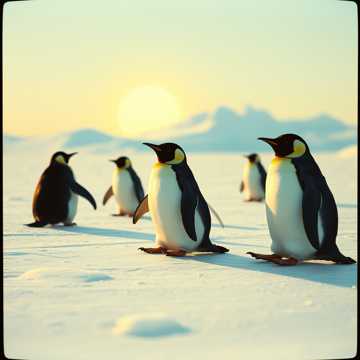 gentle Japanese twee pop with picture-book warmth, mid-slow tempo ~115 BPM, key C or G major, acoustic arrangement featuring acoustic guitar, soft brushed drums, upright bass, glockenspiel, and subtle strings; includes light field recordings (soft wind, snow ambience) to fit a cute penguin theme; warm cozy mix with childlike female vocal, playful phrasing for Japanese onomatopoeia like “よちよち”, “とことこ”, “すいすい”, layered harmonies in the chorus, bouncy but relaxed rhythm, simple melody suitable for children, tender storytelling bridge with soft whispered textures; overall mood is fuzzy, nostalgic and innocent