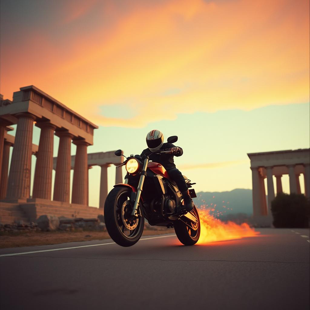 70s Greek funk/folk meets 70s psychedelic rock, vibe: riding a motorcycle by the never-ending Greek coastline, motorcycle song, pacing midtempo, dusty 70s psychedelic sound, intro with greek folk influences meets fuzzy 70s psychedelic rock riffs, verse 3 & 4 with backings, call-and-response-backings, Bouzouki, Lyra, fuzzy riffs, greek instruments, ‑pop, ‑commercial, ‑sweet, ‑happy