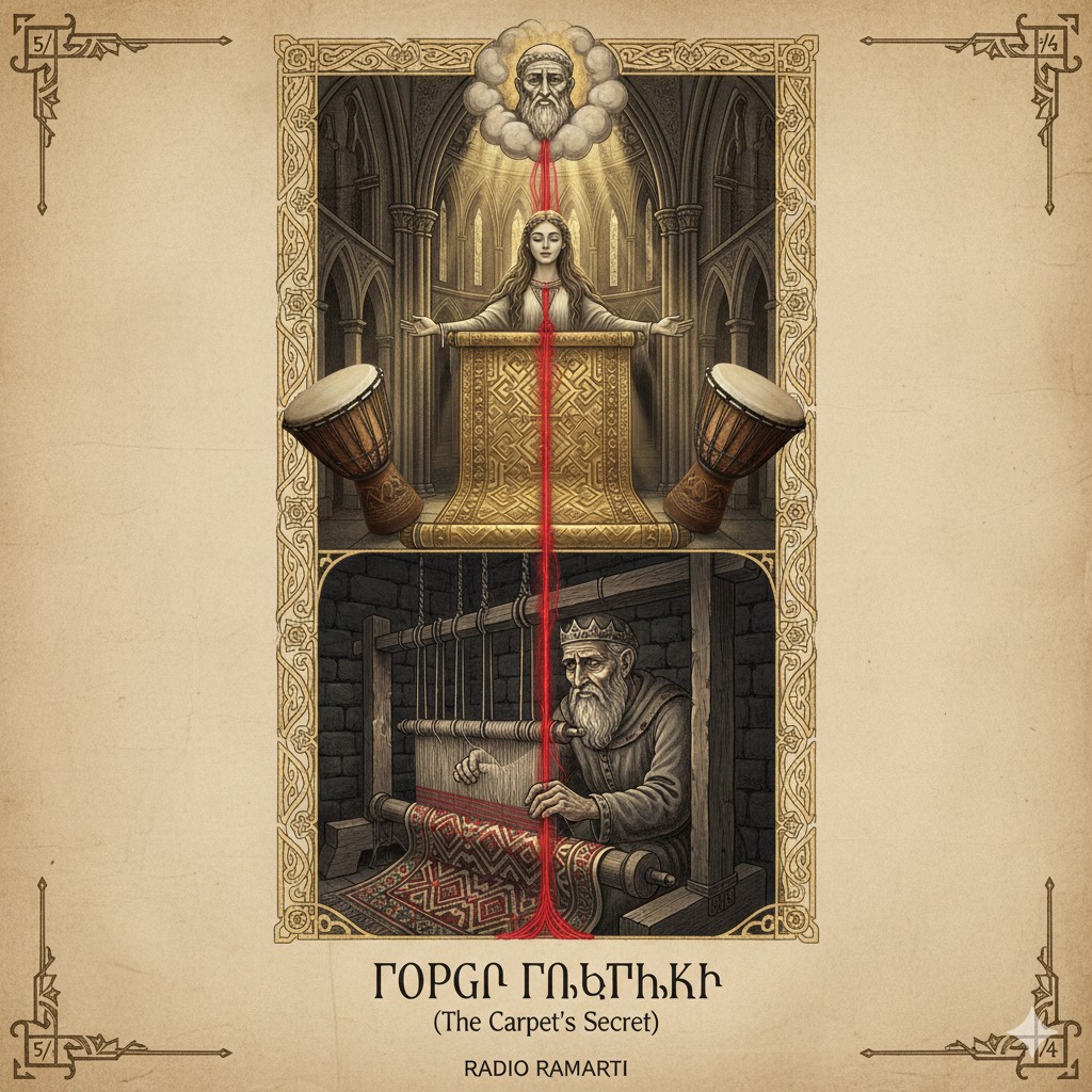 Neoclassical Dark Wave, 5/4 time, 3+2 rhythm, Ethereal Female Contralto, Microtonal Glossolalia, Wise Mature Male Baritone, Armenian Duduk, Kanun, Djembe, Deep Sub-Bass, Cathedral Reverb, Cinematic, Dramatic Silence, Tribal Pulse