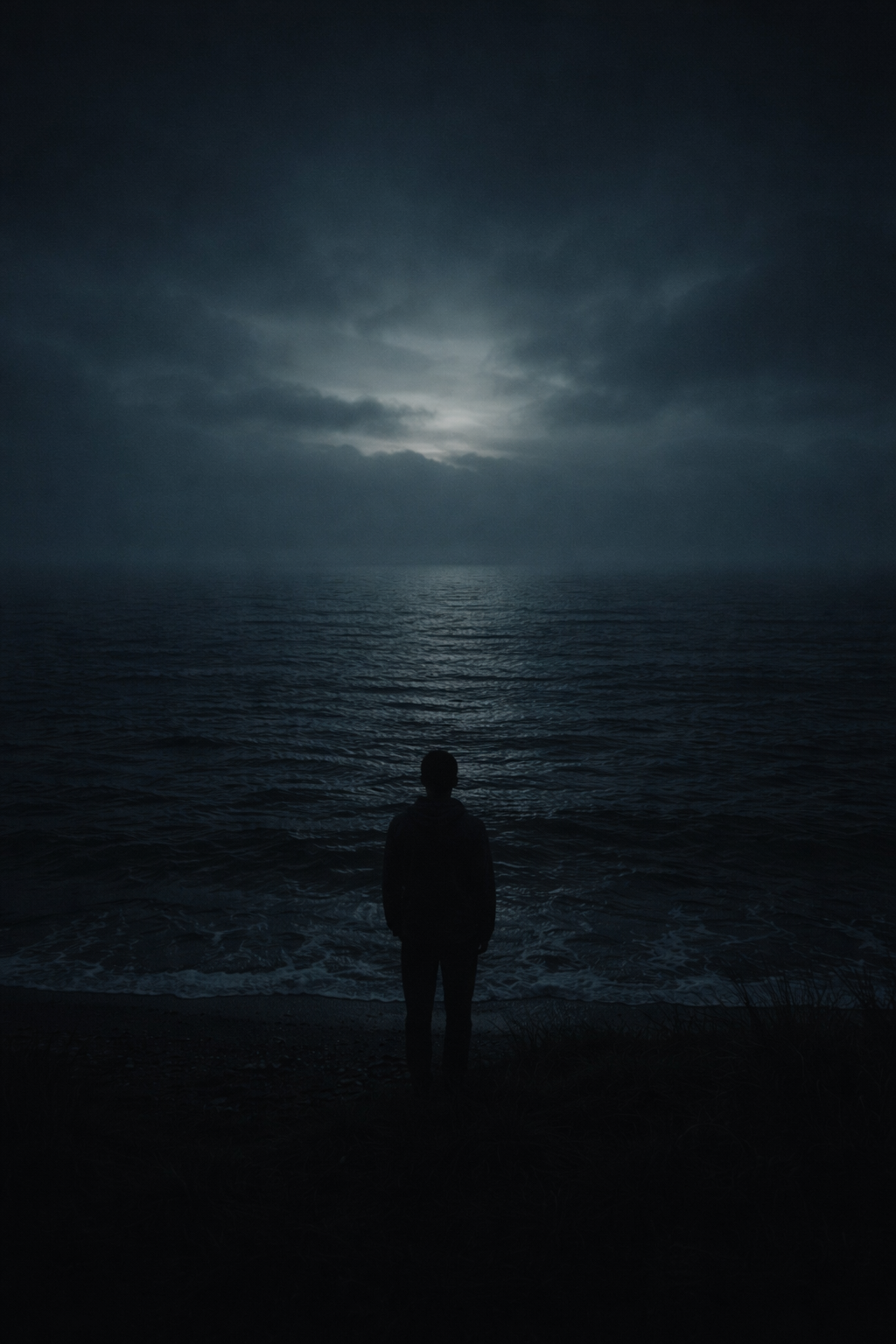 90s-inspired ambient industrial / minimalist doom rock with Middle Eastern modal influence, Slow, ritualistic tempo, Deep sub-bass drones and low analog synths swell like a tide, evoking the opening atmosphere of NIN The Great Below, Sparse, heartbeat percussion enters late, Guitars are textural and distant, processed into reverberant waves rather than riffs, Vocals are mostly non-lyrical hums and vowel tones, intimate and close-mic’d, layered into ghostly harmonies that rise and fall like breath against an endless horizon, The mood is vast, hypnotic, and aching—staring at the sea at night, feeling small beneath the void, suspended between longing and acceptance, No climax, only deepening immersion, Designed to bleed seamlessly into the final track