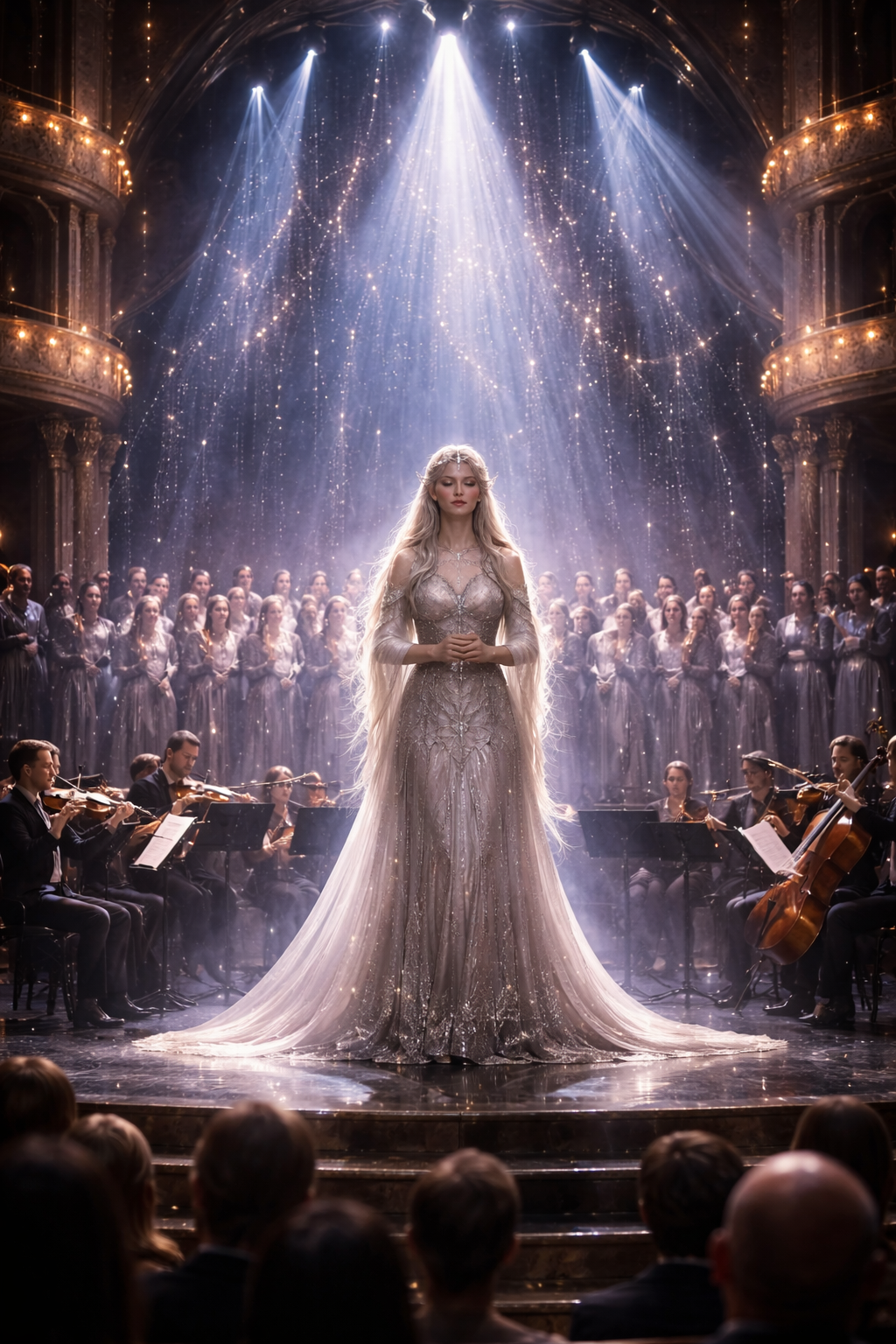 A sacred orchestral fantasy piece opens with airy harp arpeggios and luminous strings, interwoven with gentle choir pads, Ethereal female lead vocal carries a restrained, timeless melody, supported delicately by elven choir in soft, layered harmony, Verses remain minimal, the texture crystalline; chorus blossoms as voices swell, strings surge subtly, evoking luminous sorrow, Dynamics are smooth and flows eternal, with emotional restraint and minimal vibrato, The piece closes on unresolved harmonies, fading softly into ambient pads and harp, Vocals are in Quenyan Elvish