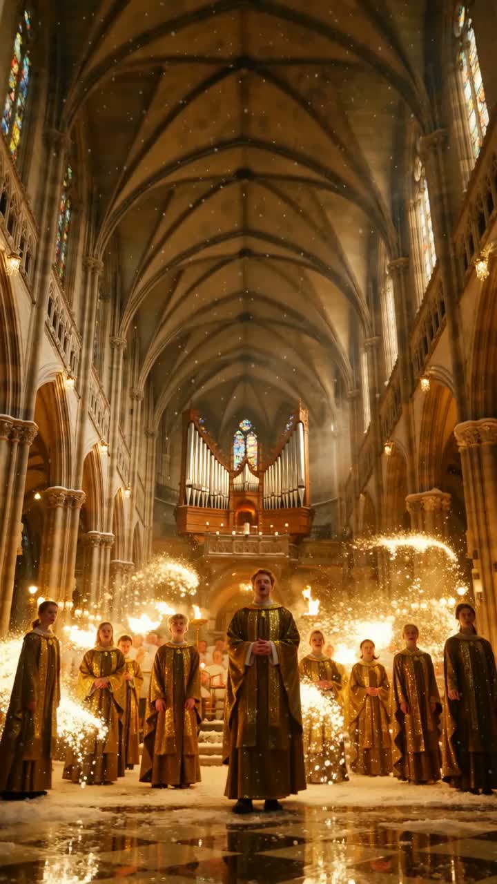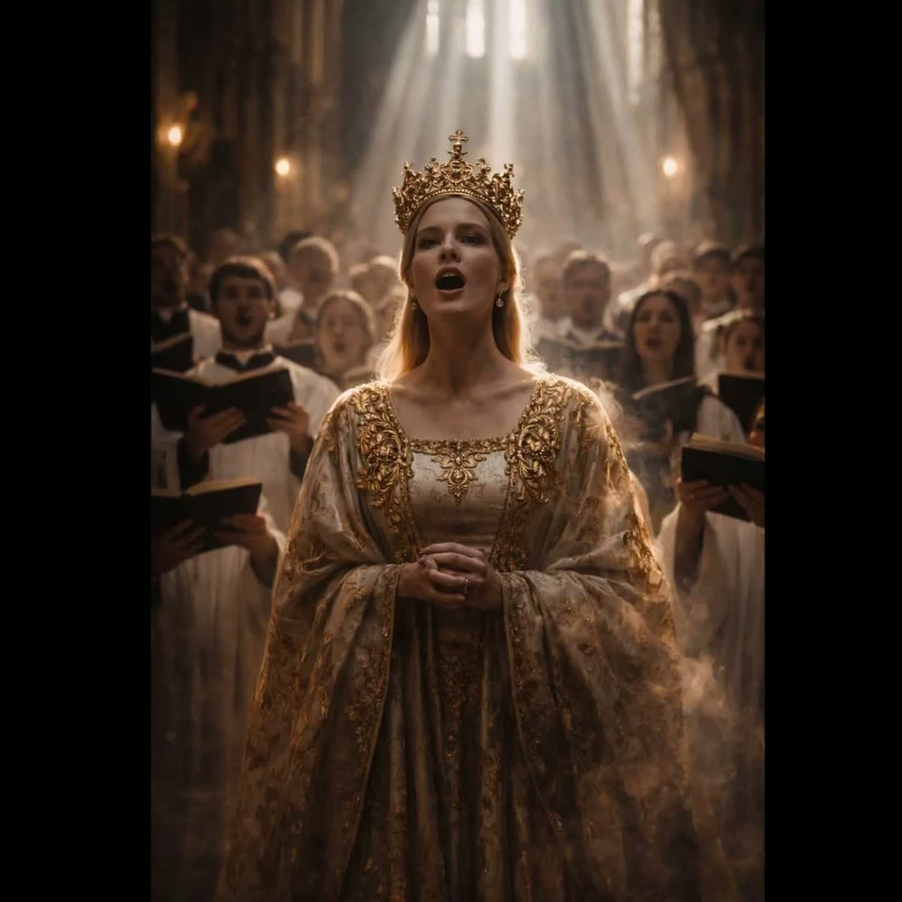 The piece opens with a slow, resonant pipe organ and deep orchestral pads to establish a spacious gothic cathedral feel, Ethereal, operatic female vocals float above, delivering haunting choral Latin harmonies, Echoing choirs, rich in reverb, swell and recede, punctuated by subtle string crescendos and low brass for depth, The dramatic progression is shaped by gradual harmonic shifts and layered counterpoint, creating a solemn, sacred—but tragically beautiful—ambiance throughout