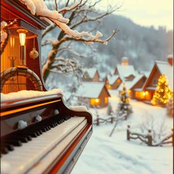 cozy pop Christmas instrumental blended with cinematic winter magic and upbeat holiday pop, Warm jazz piano, upright bass, light swing drums mixed with crisp pop percussion, bright acoustic guitar, gentle shimmering, soft brass accents, cinematic strings, chimes, and glockenspiel, Nostalgic, joyful, sparkly, magical, warm, and uplifting, Cozy verses, magical build, big upbeat chorus with classic holiday feeling, guitar outro, snowy, masterpiece
