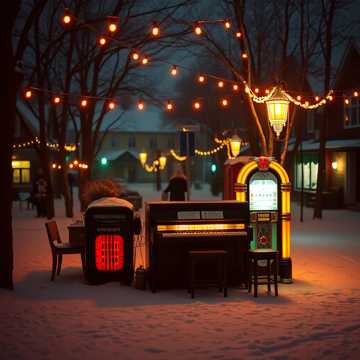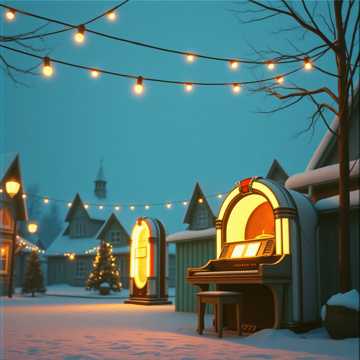 cozy pop Christmas instrumental blended with cinematic winter magic and upbeat holiday pop, Warm jazz piano, upright bass, light swing drums mixed with crisp pop percussion, bright acoustic guitar, gentle shimmering, soft brass accents, cinematic strings, chimes, and glockenspiel, Nostalgic, joyful, sparkly, magical, warm, and uplifting, Cozy verses, magical build, big upbeat chorus with classic holiday feeling, guitar outro, snowy, masterpiece, 4 minutes