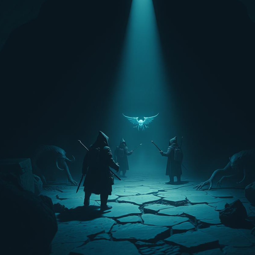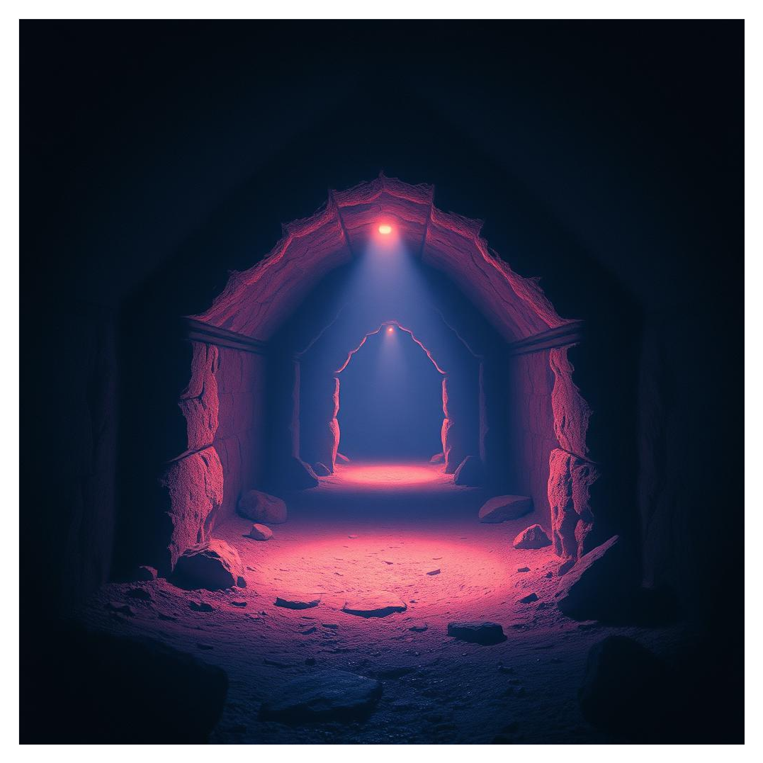 dark, brooding, cinematic dungeon theme with ambient pads, low strings, dissonant piano, ritual drums, and haunting choir