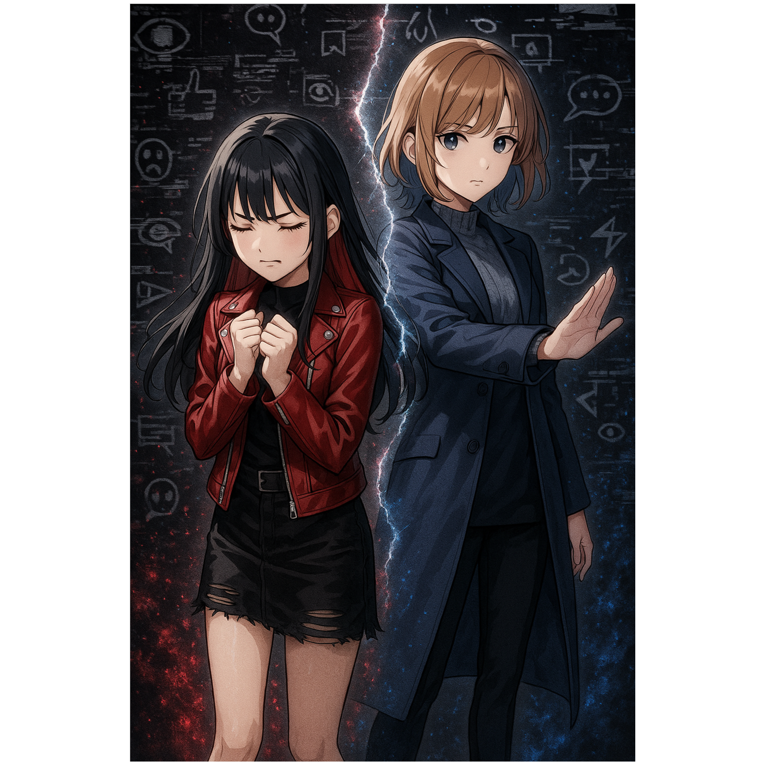 digital rock sound with punk and gothic J-rock influences, led by female vocals with sharp phrasing, emotional tension, and bitter edge, Structure features aggressive guitar riffs, glitchy electronic textures, driving bass, and modern hard-hitting drums, Dynamics shift between restrained verse sections and explosive, cathartic choruses, Emphasis on contrast, dissonance, and controlled chaos, Suitable for expressing emotional collapse, confrontation, and inner strength, Use minor key and modal transitions, Overall mix should feel urgent, raw, and contemporary, balancing distorted power with clarity, No retro elements