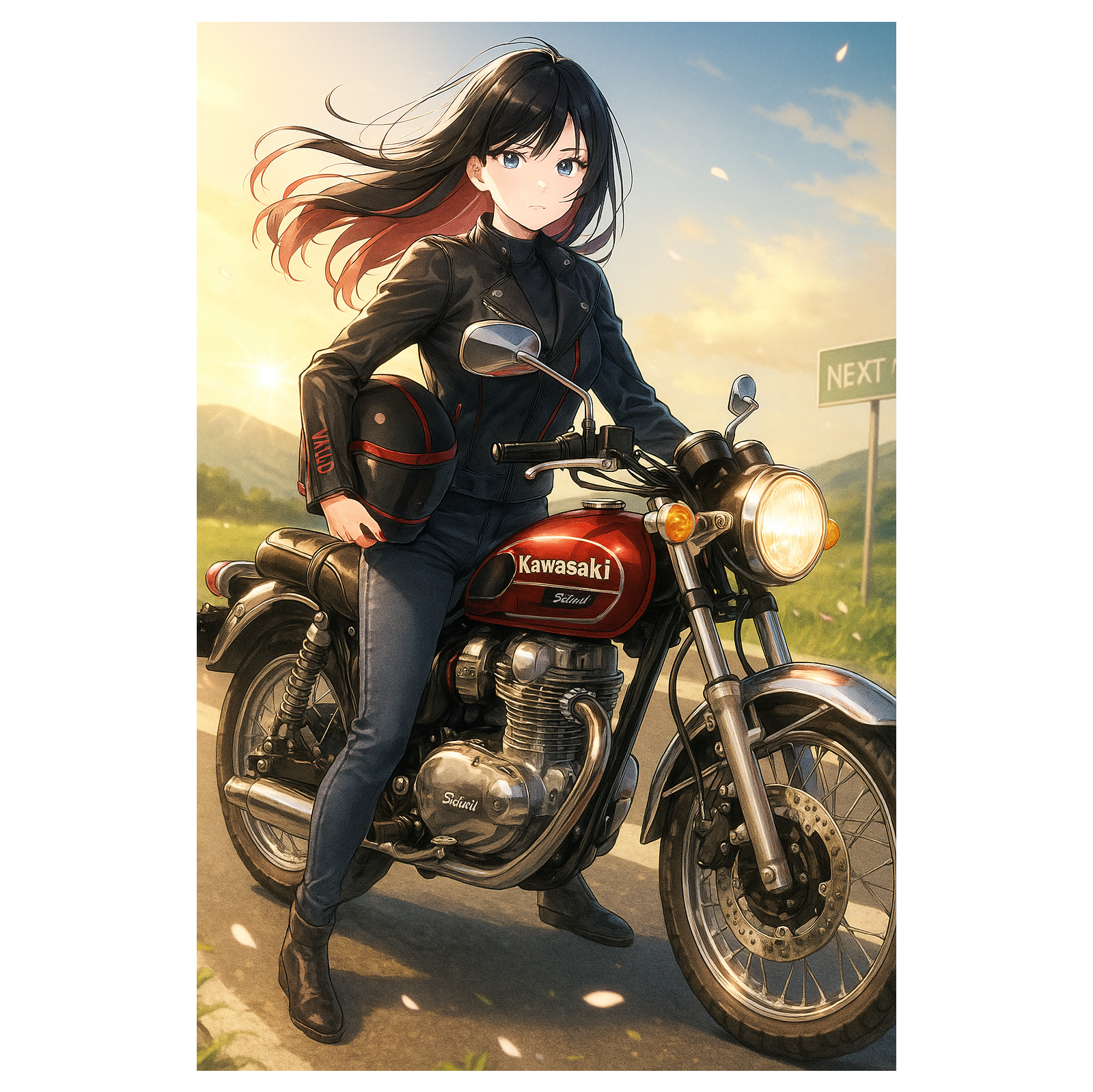 digital rock anthem blending 8-beat J-Rock with brass band and bigband elements, led by female vocals with sharp phrasing, soaring harmonies, and call-and-response energy, Features distorted electric guitars, punchy brass stabs, groovy basslines, and energetic drum patterns with EDM-infused breaks and risers, Tempo around 130 BPM, The mood is hopeful, uplifting, and determined, with a driving momentum that evokes the feeling of accelerating through open roads on a journey toward freedom, Explosive choruses contrast with reflective pre-choruses and anthemic refrains, No retro elements, Suitable for a story about breaking free and chasing dreams
