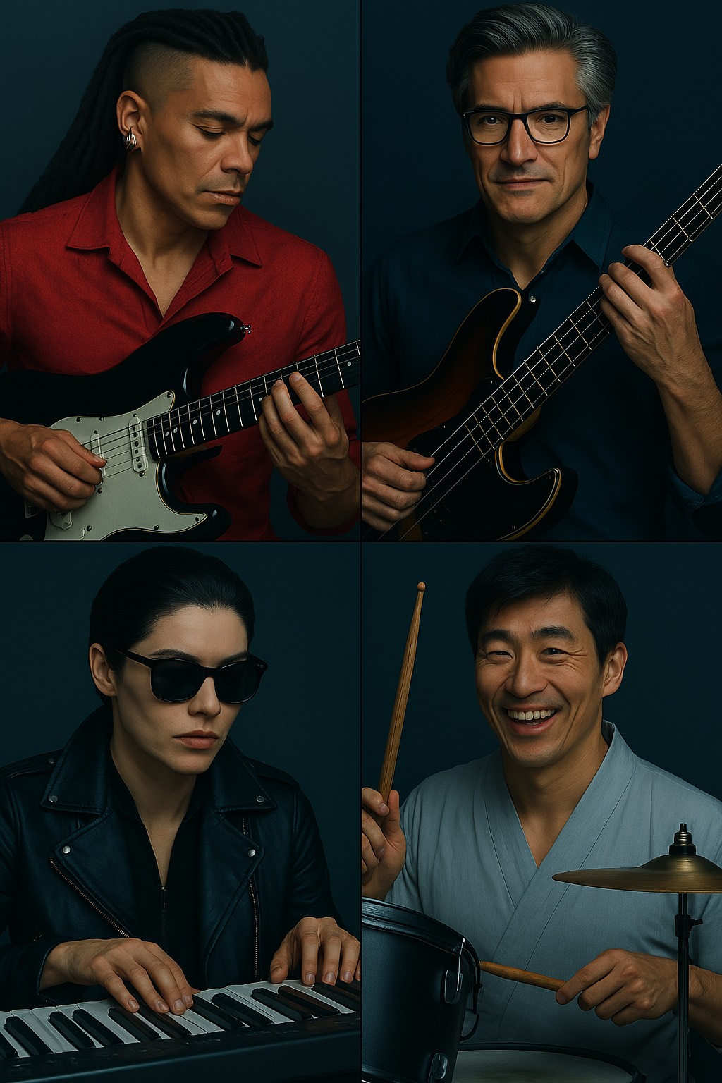 An instrumental track centered around ultra-fast alternate picking guitar solos with aggressive, technical phrasing, Tempo ranges from 140–160 BPM, The guitar tone is metallic and sharp, blending jazz fusion complexity with rock intensity, The bass is heavy, distorted, and twists with a rubbery, snaking motion, dominating the low-end, Drums are breakbeat-inspired with rapid, intricate snare and hi-hat patterns, Analog synths and electric piano expand the atmosphere, Futuristic, mechanical, and emotionally distant, No vocals