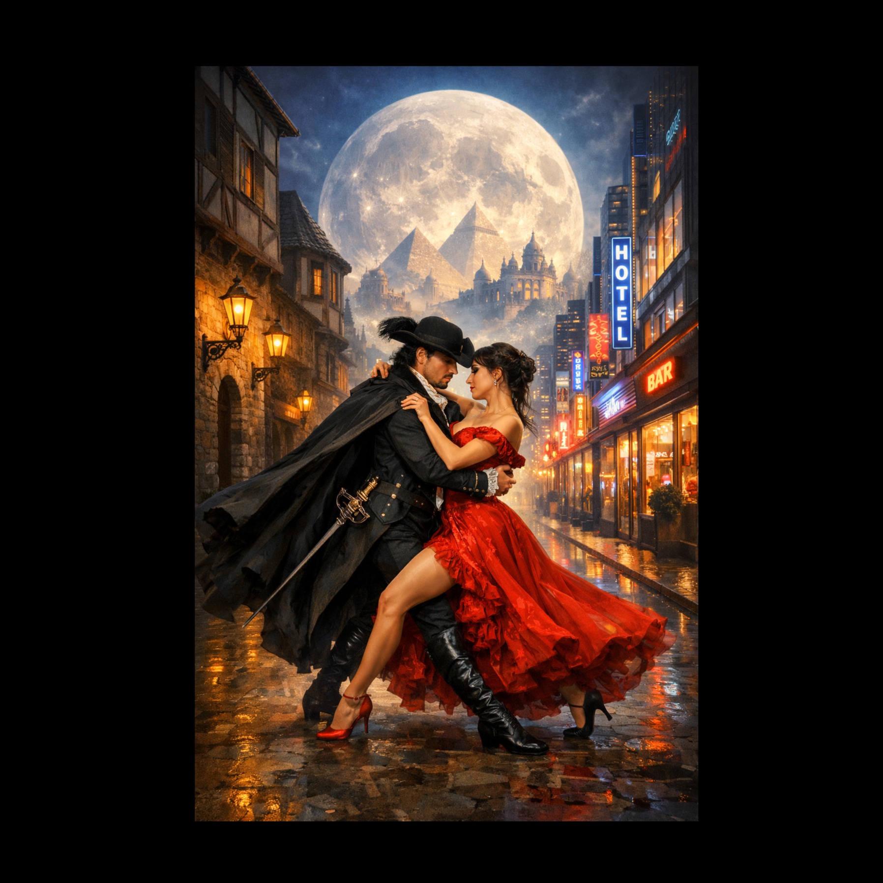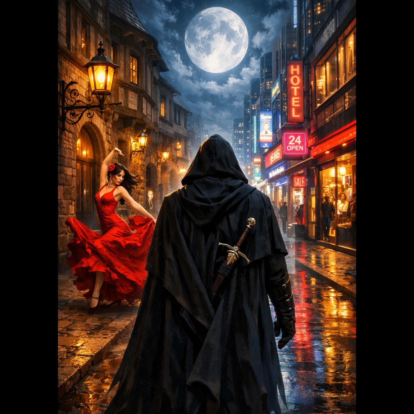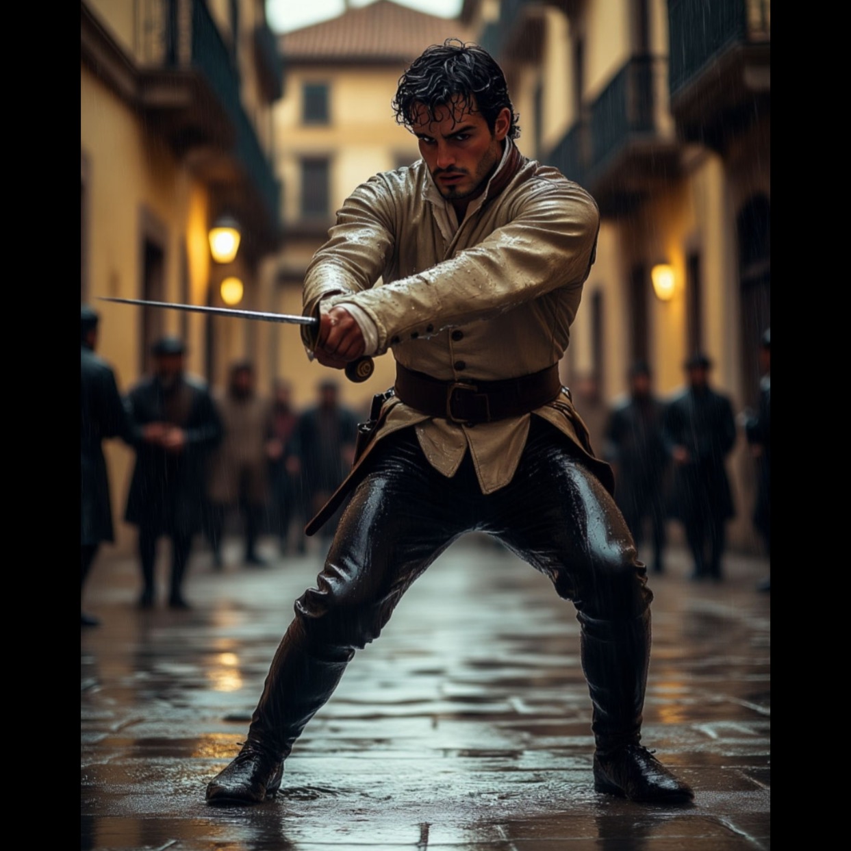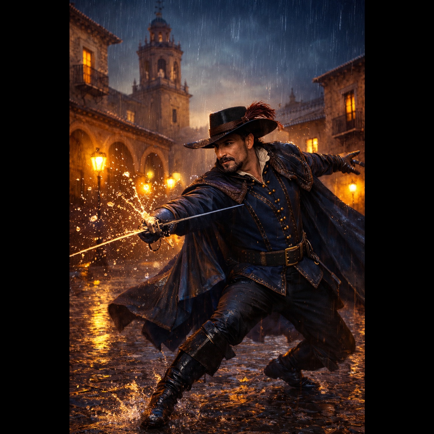 A dark pop flamenco-rock fusion with a pulsing beat and expressive rough male baritone vocals, German lyrics about a mysterious master of steel dancing in the rain at night, The sound is cinematic, haunting, and sensual, combining deep electronic bass with live flamenco guitar and rock elements (distorted electric accents, subtle snare buildup), Mood: dark, tense, mysterious, urban legend vibe, Tempo: 110 BPM, Vocal style: husky, emotional, whisper‑growl male baritone — halfway between a flamenco singer and a dark-pop storyteller