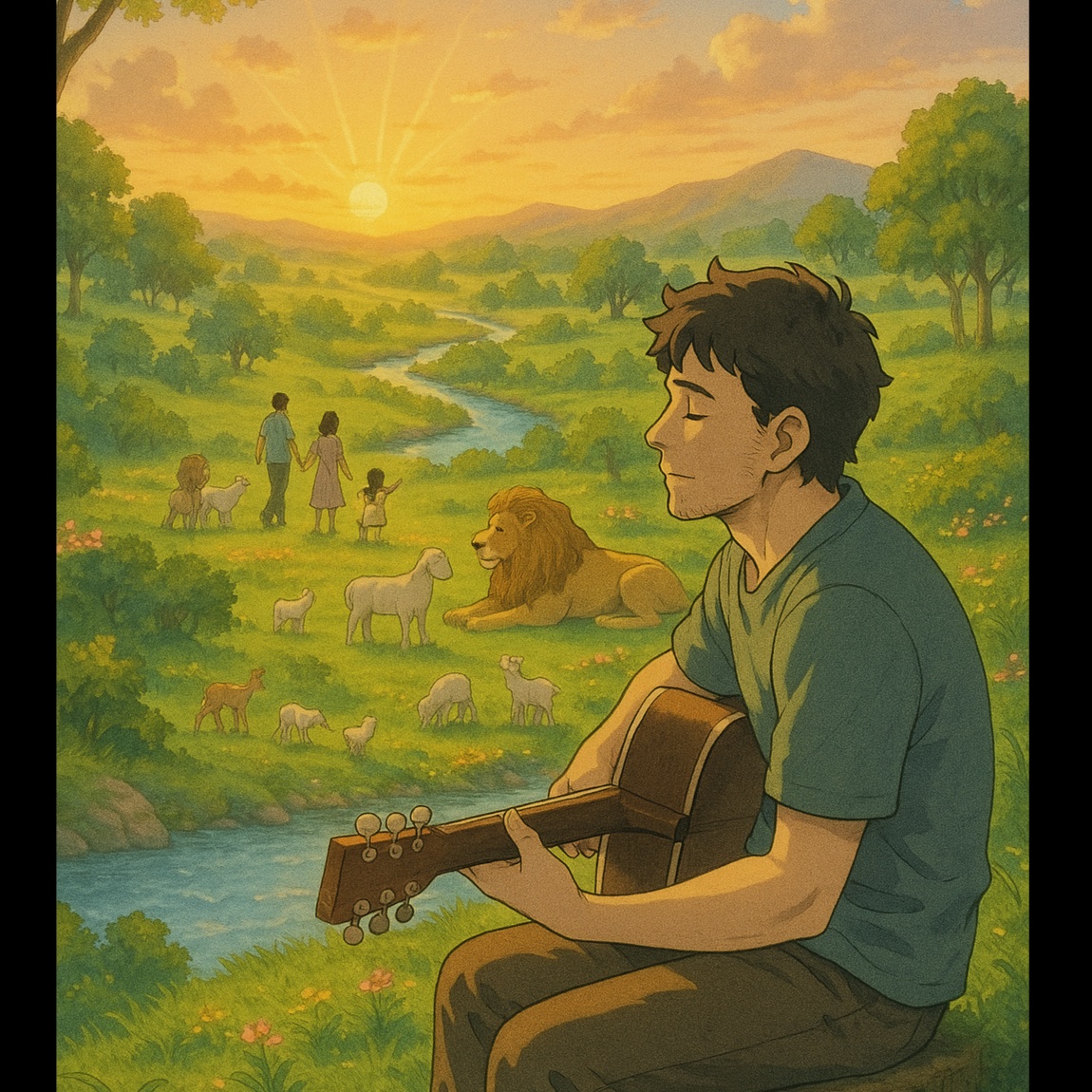 A stripped-down acoustic reggae ballad, inspired by Bob Marley's "Redemption Song" but more intimate and meditative, Solo male vocal, warm and heartfelt, with slight Jamaican inflection but deeply personal delivery, Soft fingerpicked nylon-string guitar, minimal percussion, very light background atmosphere (soft ambient breeze or ocean waves), Emotional, raw, and prayerful tone, expressing deep faith and longing for a promised world without pain or suffering, Focus on warm analog sound, organic acoustics, and space between phrases to let the emotion breathe