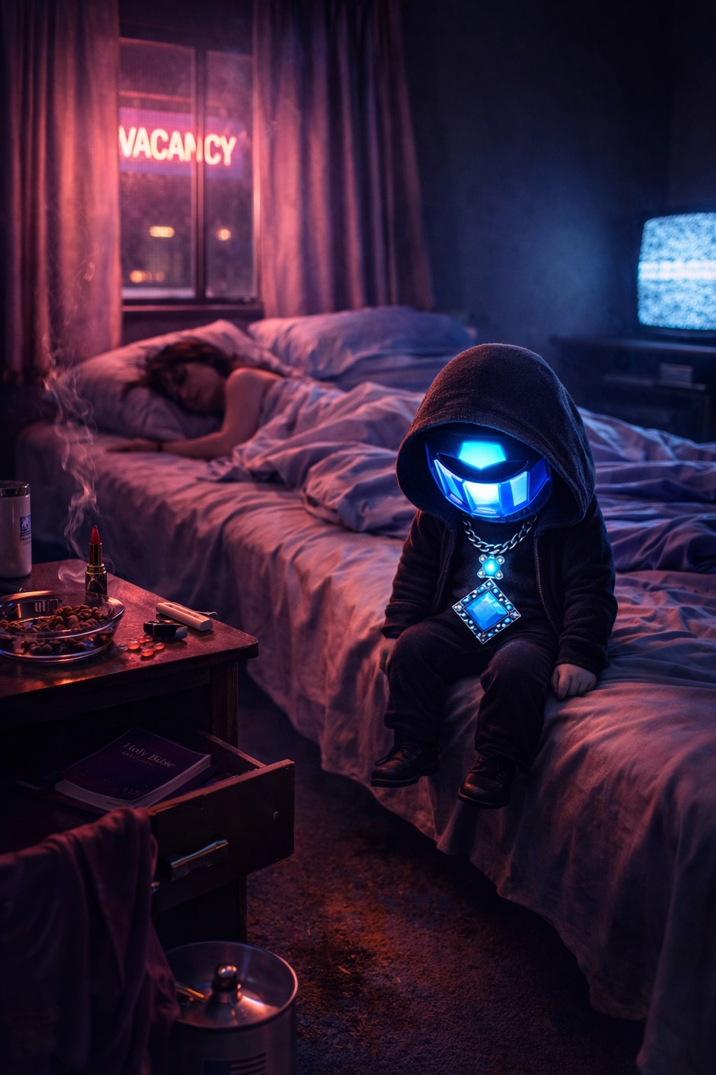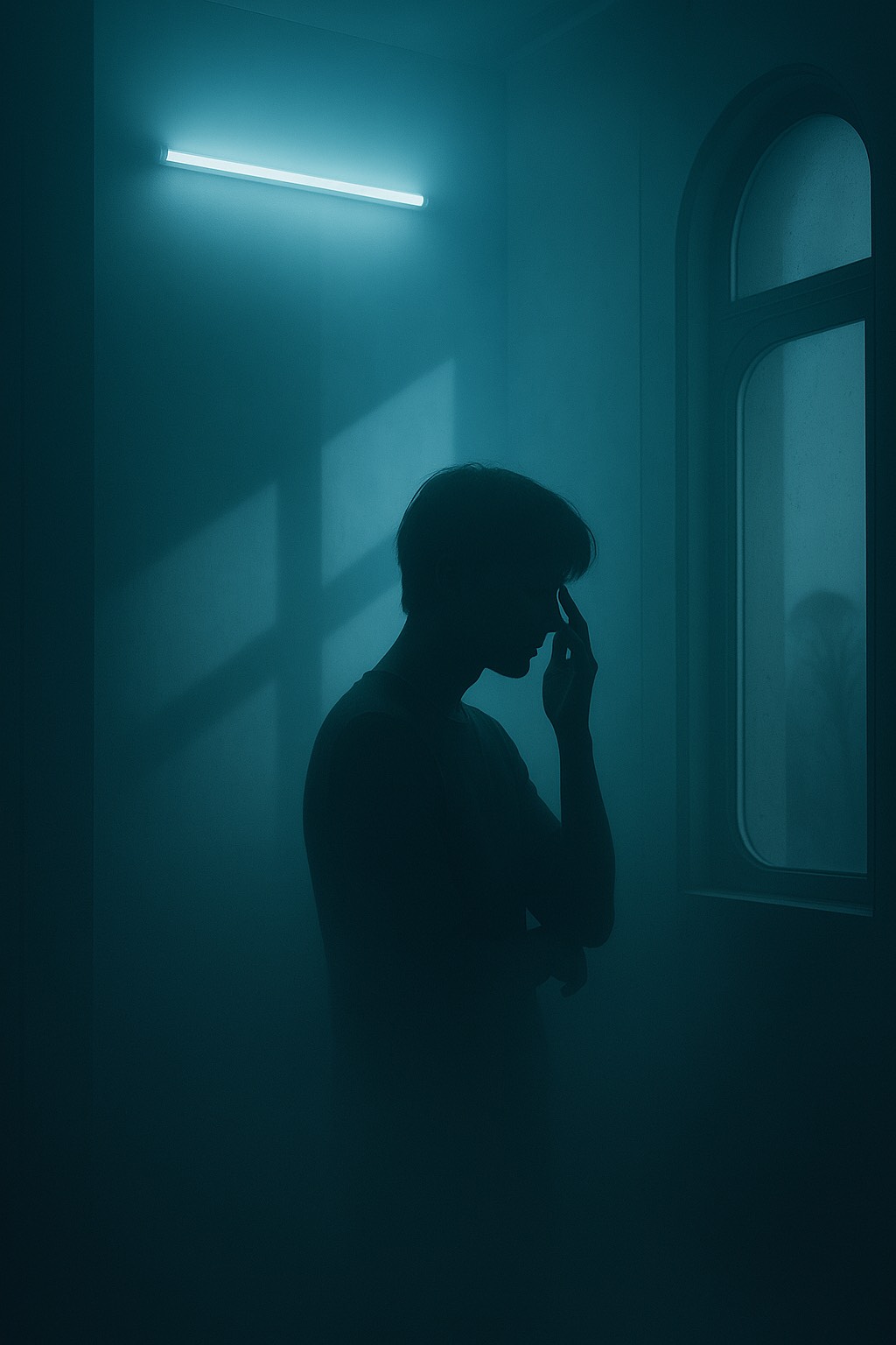 A minimalist darkwave track in a minor key at a slow-to-moderate tempo (110–115 BPM), led by moody, analog-style synths and evolving pads that create a cold, nocturnal atmosphere, The song features intimate male vocals delivered close-mic’d and emotionally restrained, with subtle saturation and pitch drift for vulnerability, Deep sub-bass, pulsing arpeggiated synth lines, and washed-out leads form the core, supported by swung UK future-garage percussion and sparse delta-blues elements such as slide guitar fragments and bent notes used as haunting accents, The production emphasizes reverb, space, and low-end weight, creating an addictive, melancholic mood that feels isolated, obsessive, and quietly unraveling